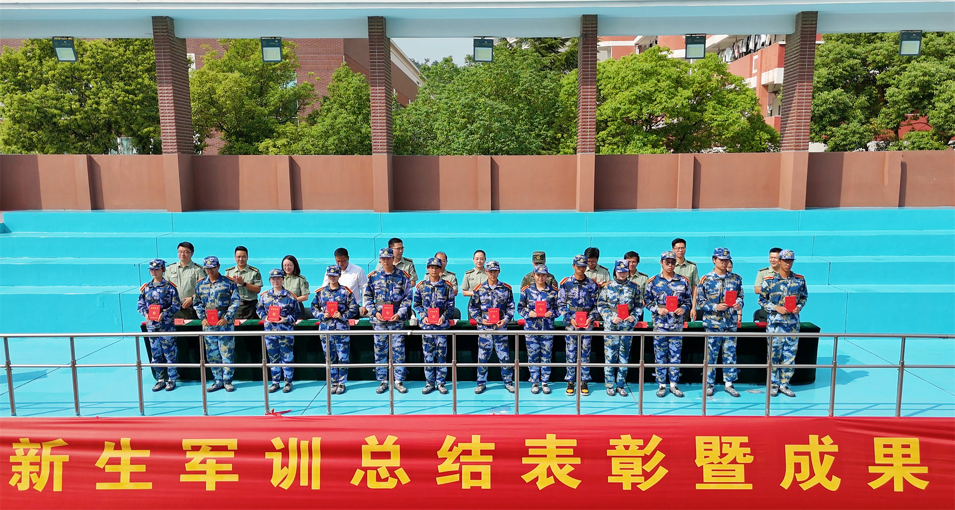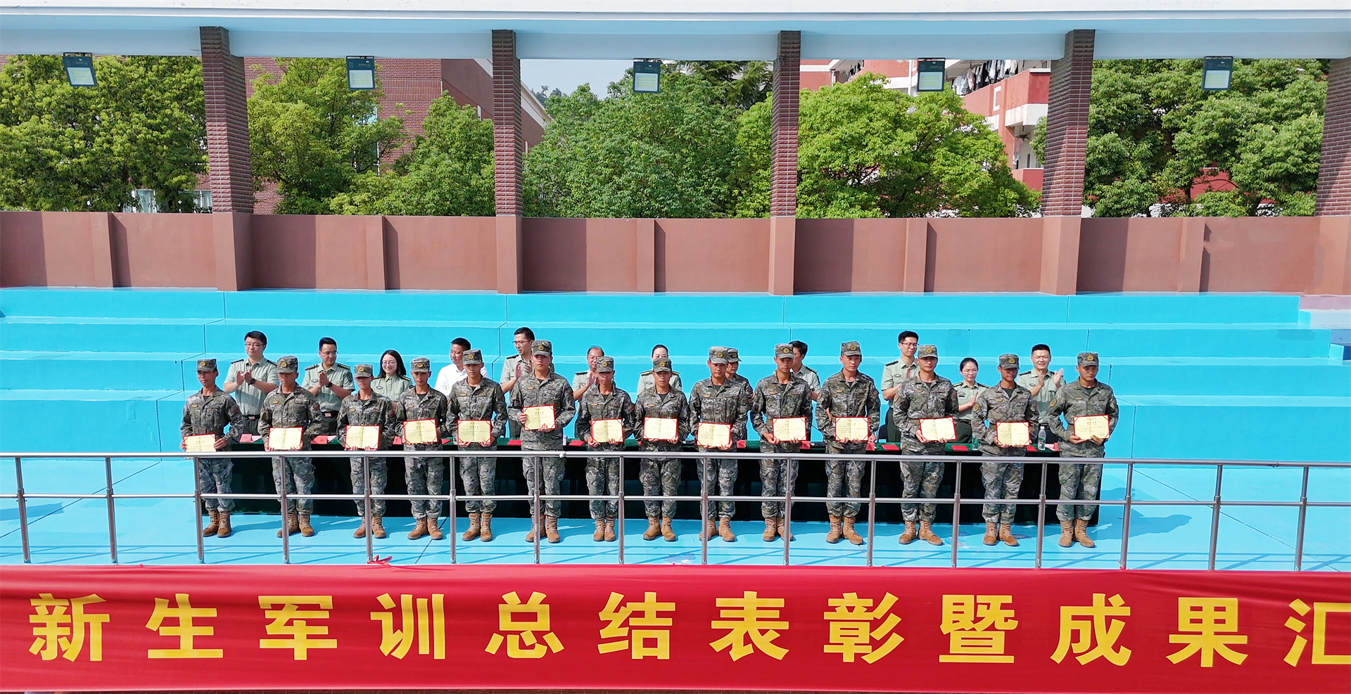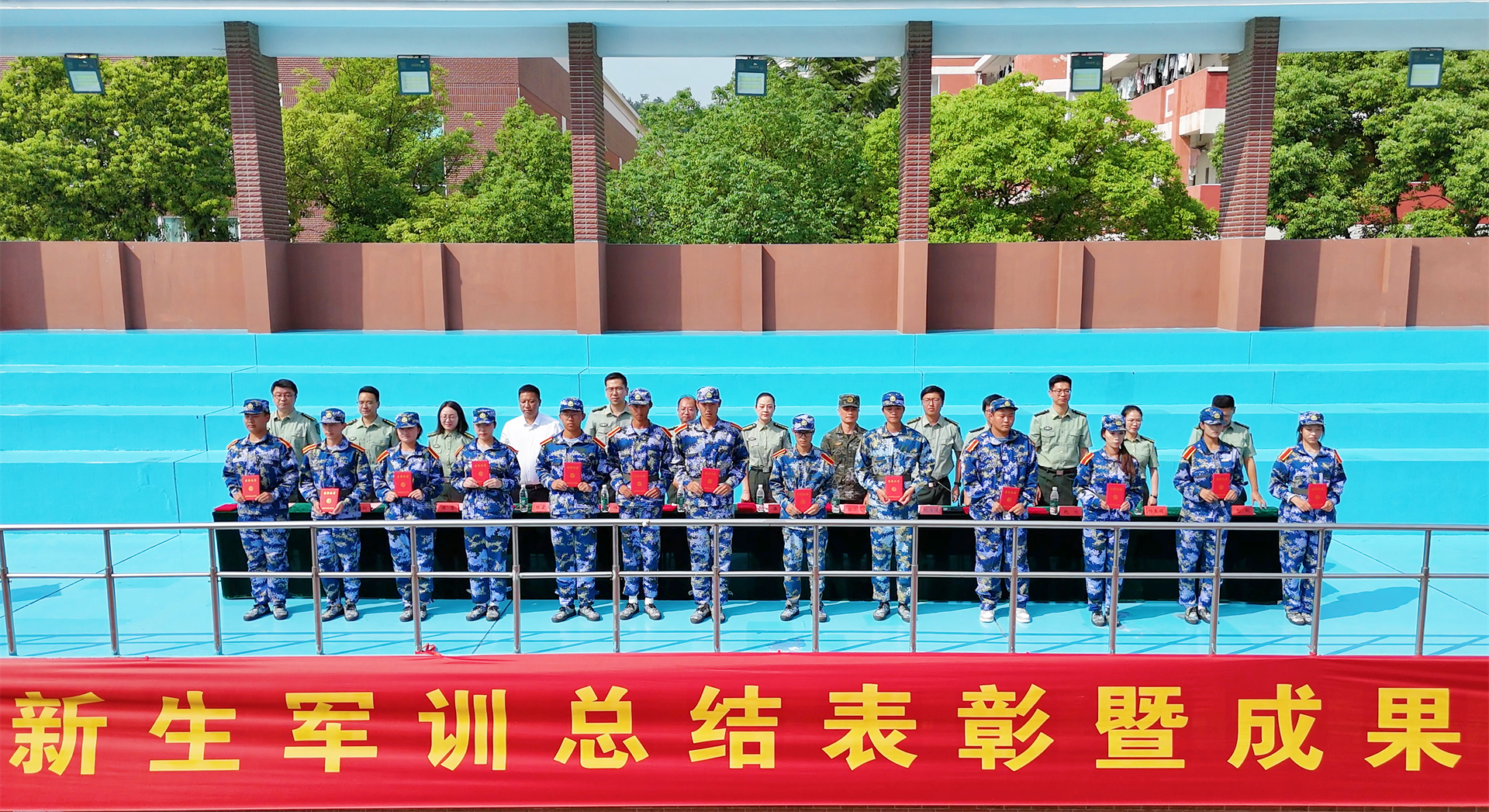 军训工作领导小组成员为军训内务卫生先进单位、军训优秀学员代表、军训标兵代表、军歌大合唱获奖单位及军训优秀教官分别颁发了荣誉证书。