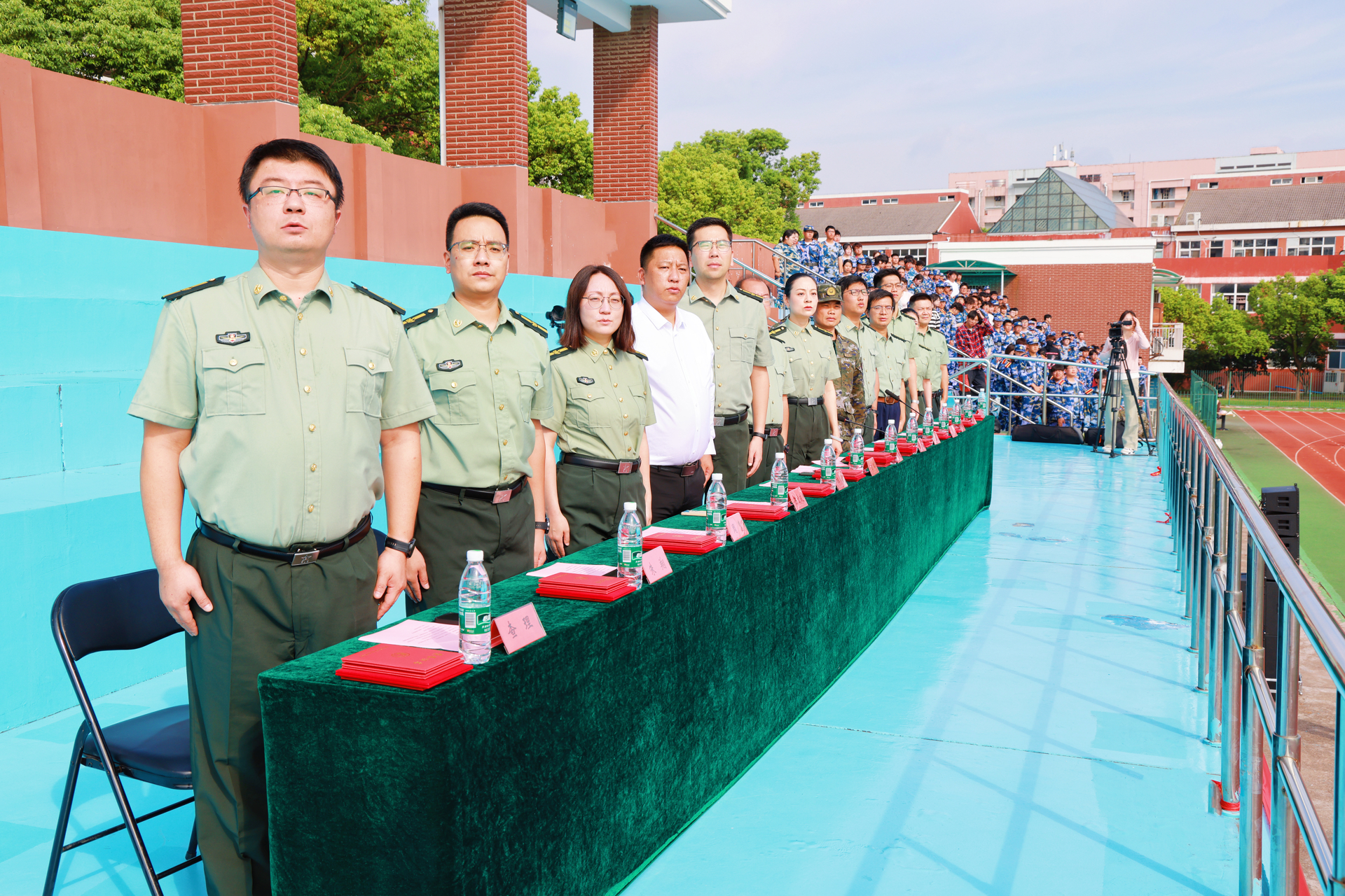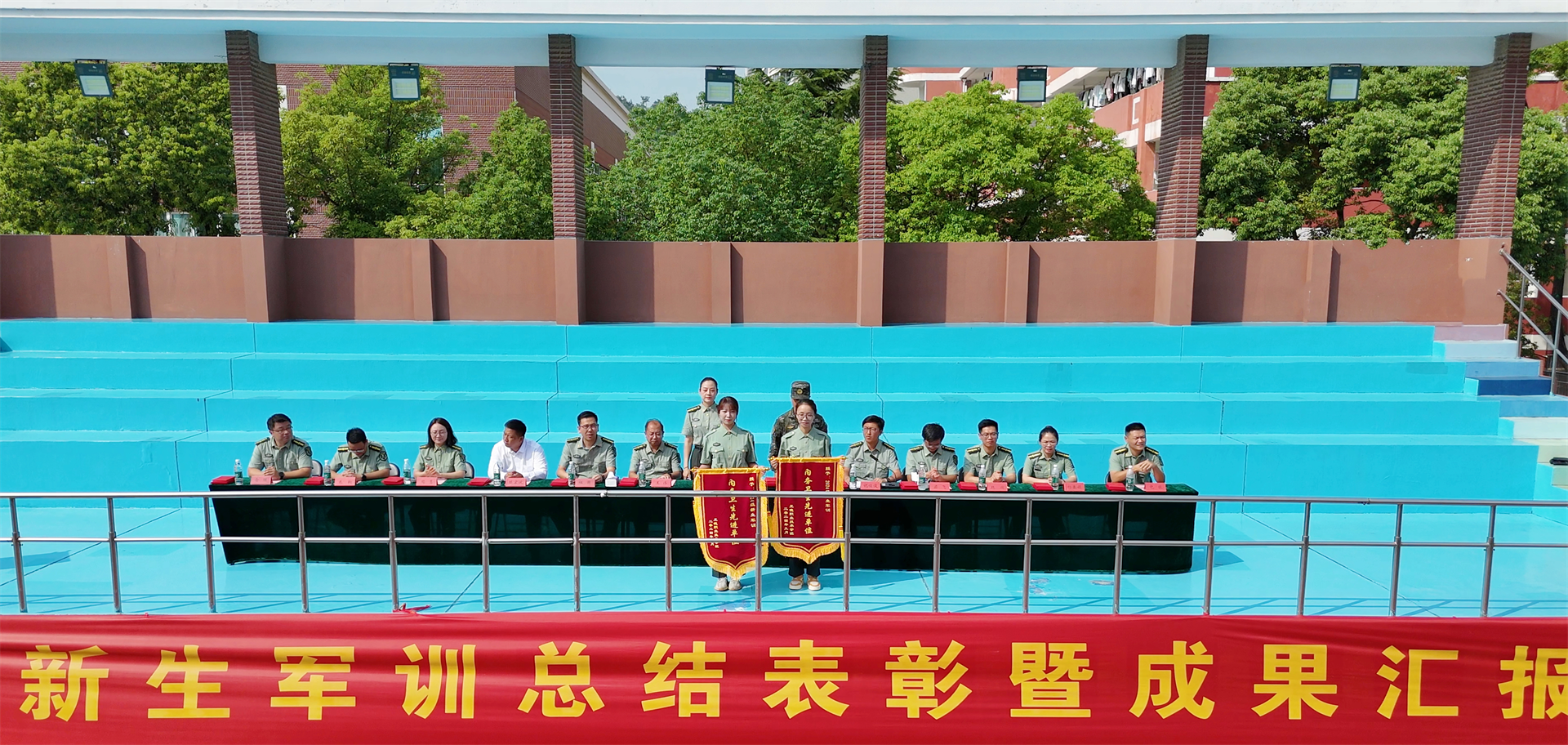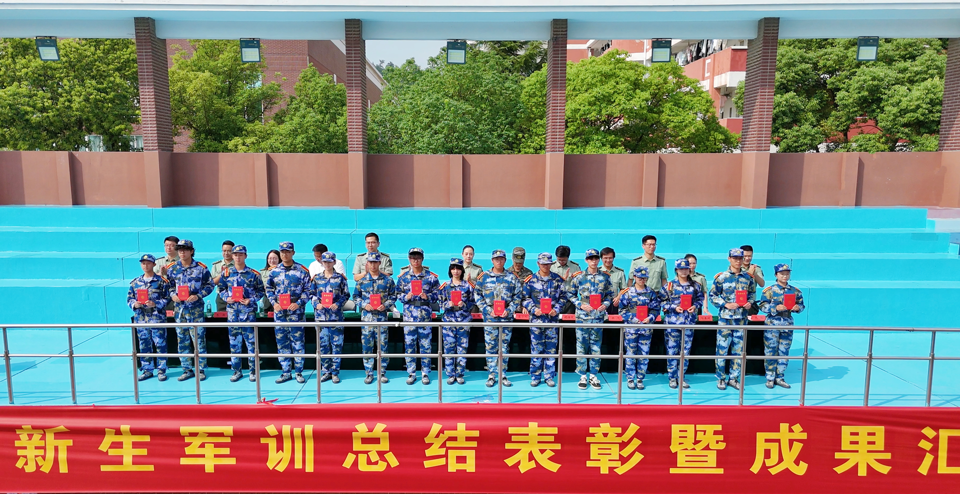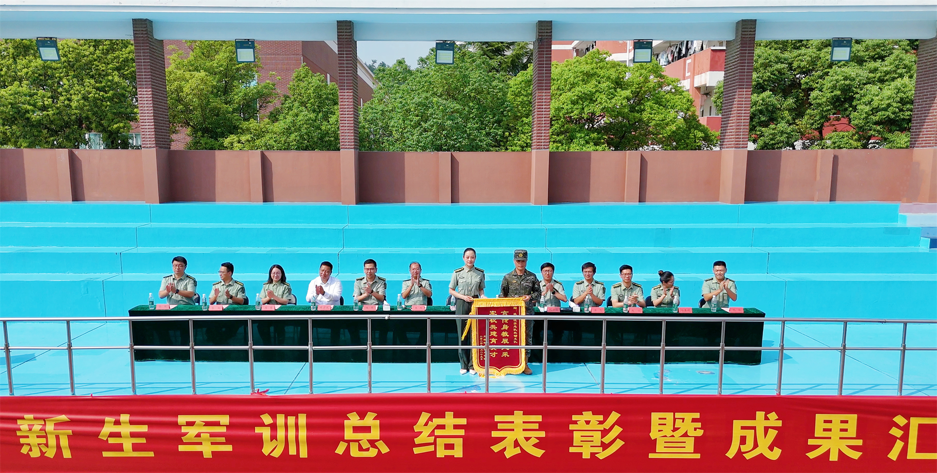 军训工作领导小组成员为军训内务卫生先进单位、军训优秀学员代表、军训标兵代表、军歌大合唱获奖单位及军训优秀教官分别颁发了荣誉证书。