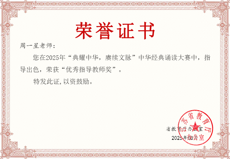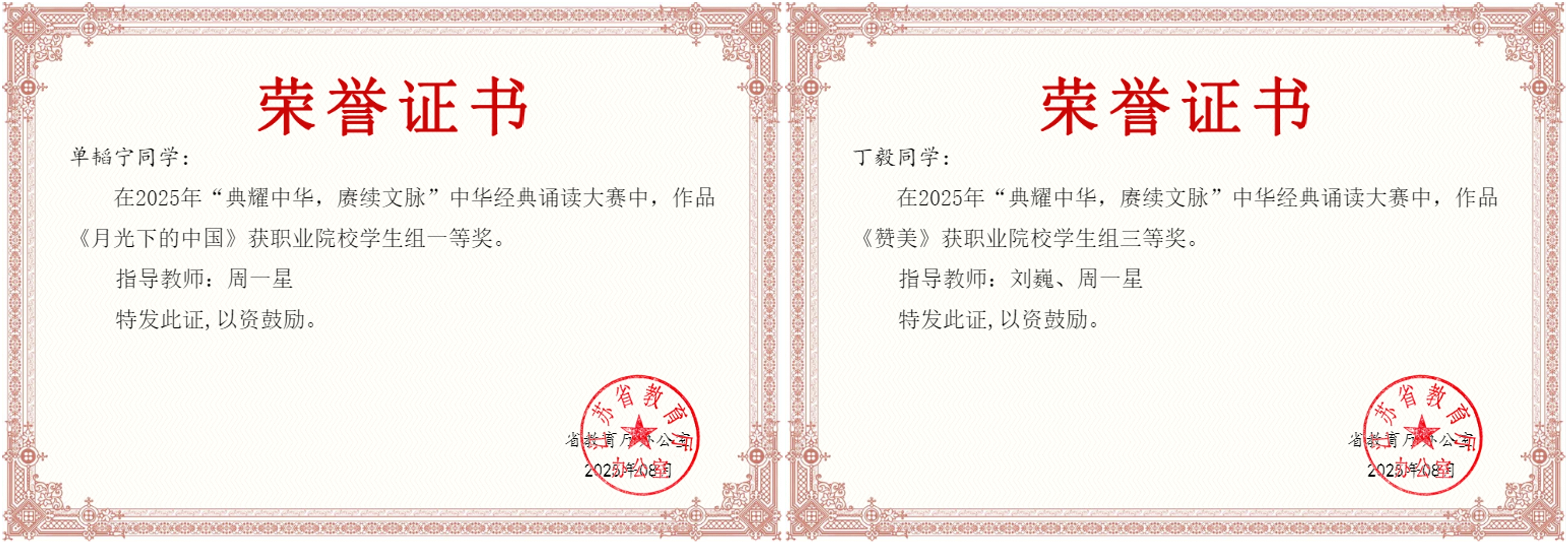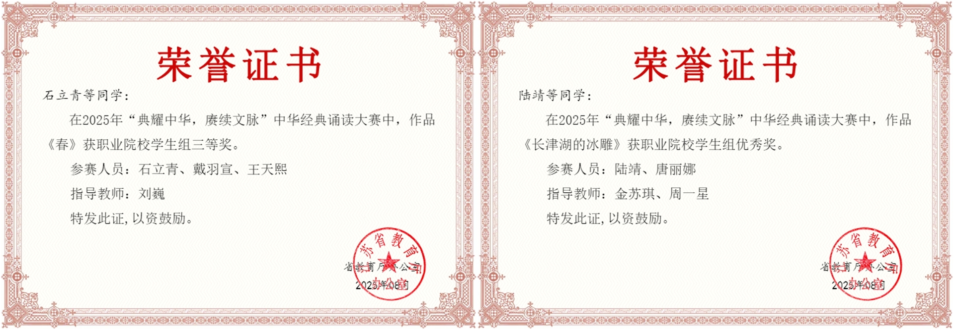 近日,2025年“典耀中华 赓续文脉”中华经典诵读大赛获奖结果公布。我院报送作品获职业院校学生组一等奖1项、三等奖2项、优秀奖1项,教师组一等奖1项、三等奖1项,其中两项一等奖作品入围国赛,周一星老师荣获优秀指导教师奖,所获成绩取得新突破。