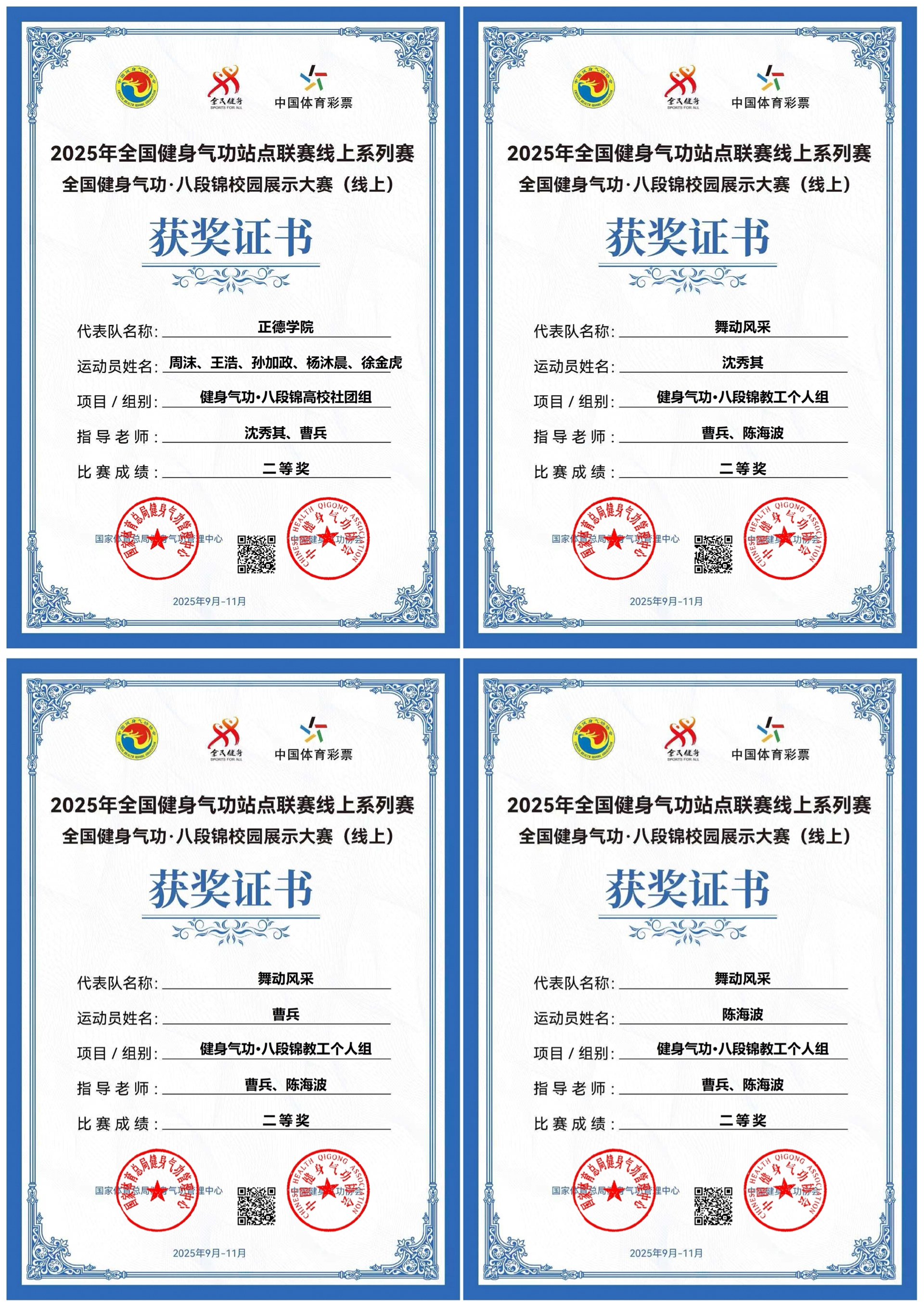 近日,由国家体育总局主办的2025年全国健身气功·八段锦校园展示大赛(线上)圆满落幕。本次大赛采用线上提交参赛视频的形式进行,吸引了来自全国高校的1216支队伍提交作品参赛,竞争激烈。我院代表队凭借扎实的功底、精湛的技艺和昂扬的精神风貌,经过严格评审,最终荣获教工个人组二等奖3项、学生组二等奖1项的优异成绩。