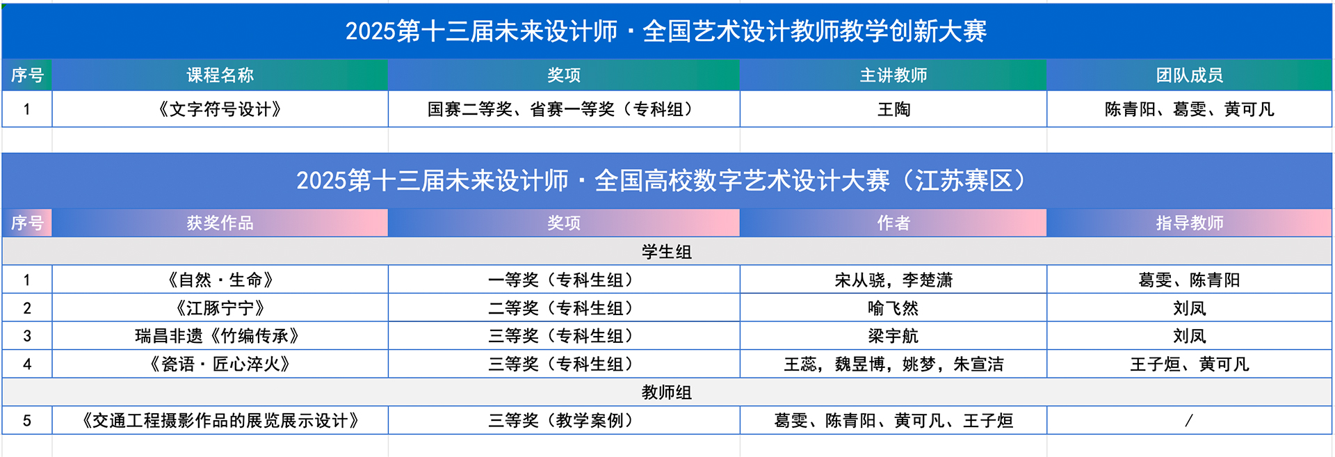 近日,2025年第十三届“未来设计师·全国高校数字艺术设计大赛(NCDA)”暨“未来设计师·全国艺术设计教师教学创新大赛(NDTC)”评审结果揭晓。我院师生在本届大赛中斩获国家级奖项 1 项,省级奖项 5 项,实现学院在该赛事中奖项数量与等级的突破!