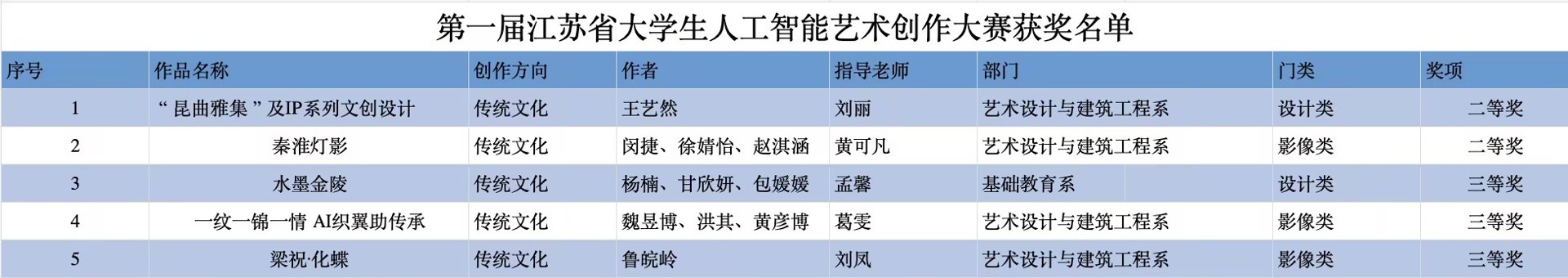 近日,由江苏省教育厅主办,南京信息工程大学和南京林业大学共同承办的“艺启AI·智绘未来”第一届江苏省大学生人工智能艺术创作大赛圆满落幕。我院学生获得二等奖2项、三等奖3项,其中2件作品入围现场展览。