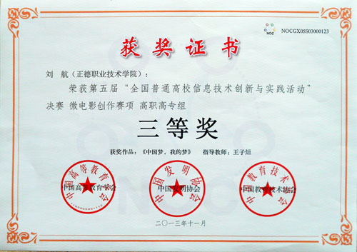比赛分为现场创作与陈述答辩两个环节,来自全国近百所高校的千余名选手现场进行激烈的比拼与较量,我院参赛的各位同学们在王子烜、张泽扬两位老师指导下从前期选题和拍摄到后期编辑与制作进行了充分准备,最终,11级电子与信息工程专业学生叶志达的作品《最美的星光》、12级机电一体化专业学生刘航的作品《中国梦,我的梦》获得三等奖,12级新闻采编与制作专业学生杨雷的作品《为雅安祈福》、12级营销与策划专业学生仲心意的作品《志愿者“三下乡”社会实践活动》获得二等奖。