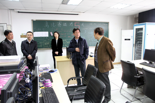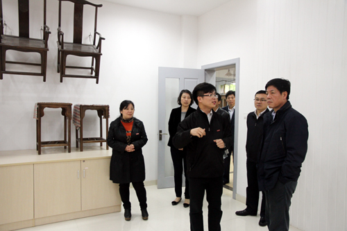 陈夏初(右一)检查我院艺术设计与建筑工程系实训工场建设情况