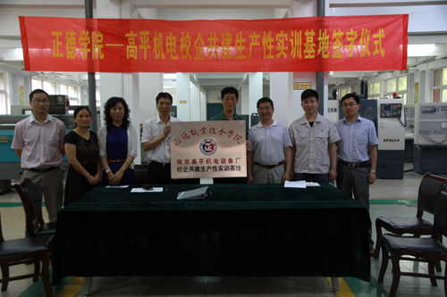 2014年6月6日下午,“正德学院-高平机电校企共建生产性实训基地签约仪式”在我院数控技术实训基地隆重举行。副院长刘小廷、教务处长章庆国、机电工程系主任马金平、南京高平机电设备厂总经理周金明参加了签约仪式。