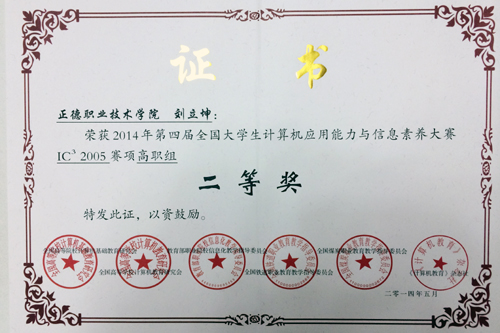 共有291个院校代表队,总计15000名学生参加本届大赛,最后进入总决赛的院校代表队有221个,比赛竞争十分激烈。我校代表队在本届大赛中沉着应战,不畏强手,表现优异,取得了可喜成绩。分别获得大赛IC³-2005组一等奖和二等奖的好成绩,其中电子信息工程技术专业的黄鑫获得一等奖,计算机软件专业的刘立坤获得二等奖。这次我院学生在全国重要赛事中获得大奖,彰显了我院在人才培养,特别是计算机应用教育教学方面的实力。