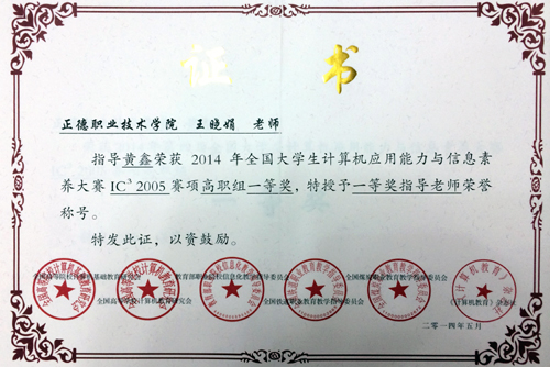 王晓娟老师获得“一等奖指导老师”荣誉称号