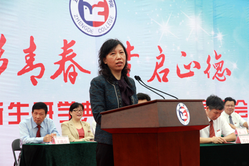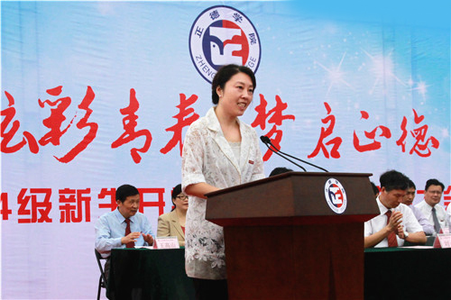 典礼的气氛庄严而令人振奋,主席台背景板上“炫彩青春 梦启正德”八个大字格外醒目。大会在雄壮国歌声中拉开帷幕,全场师生面对国旗方向肃立致敬。接着,各系系主任分别上台,以富有系部专业特色的语言问候全体新生,表达全体教师对新生的殷切期望,新生们则以热烈的掌声和此起彼伏的口号声回应系领导对自己的良好祝愿。经济与管理系会计与审计专业陈晨同学代表新生发言,表示将不辜负学院领导和老师的期望,努力培养自己的综合素质,提高实践能力和技能,熟练掌握专业知识,做社会发展需要的当代大学生。我院国际经济与贸易专业2006届毕业生,江苏鸿翔电缆有限公司总经理储辉代表校友发言,他深情回顾了自己的正德岁月,勉励广大学弟学妹们抓住课堂学习,积极思维,以科学的学习方法尽量多增加知识积累,为自己未来的人生之路打下坚实基础。