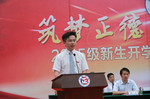 在热烈的掌声中,院长庄群华发表讲话,他首先代表全体师生员工,对2015级新生选择正德,加入正德大家庭表示热烈的欢迎。他在讲话中简要回顾了我院的办学历史以及办学以来所取得的成绩,并对2015级新生提出了三点希望和要求:一是希望同学们学会做人。他指出,我院在学生教育中一贯强调的“孝、宽、诚、责、毅”五字教育就是要求每一位正德学子要具有孝道、宽容、诚信、责任、毅力这些优良品格,成为一名具有责任感的人;二是希望同学们学会学习。在当前职业教育快速发展的形势下,真正热爱自己的专业,学好自己专业,培养过硬的专业技能,同时还要注意综合素质的全面提高,适应社会对复合型人才的需求,赢得自身更加广阔的发展空间;三是希望同学们学会生活。要学会营造和谐的人际环境,努力在相互磨合中求同存异,在勤奋学习的同时要健康生活,保持乐观心态,在自己青春岁月画下绚烂的一笔。讲话结束后,他还为新生代表们佩戴了校徽。