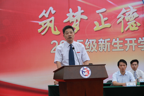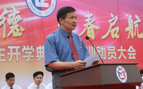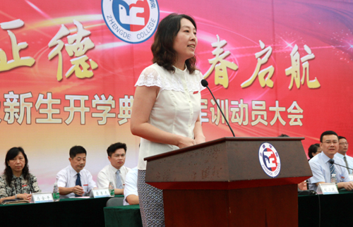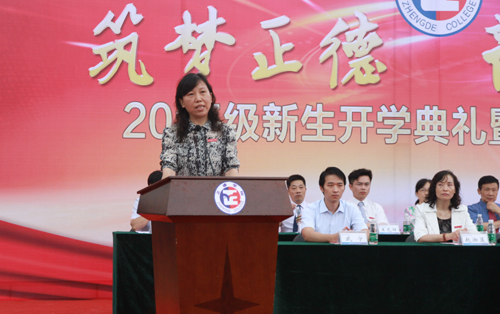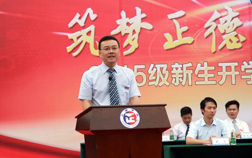 9月15日上午,我院隆重举行“筑梦正德 青春启航”2015级新生开学典礼,院长庄群华在讲话中勉励全体新生在未来三年的大学学习生活中学会做人、学会学习、学会生活,在正德学院这片沃土上放飞自己的青春理想。学院党委书记、副院长左彤云、副院长刘小廷、赵凯雷,院长助理赵湘莲、王健以及各单位主要负责同志出席典礼。左彤云主持了开学典礼。