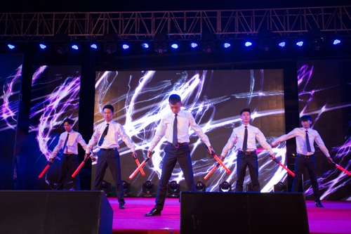 由承训部队教官带来的街舞《SUPER BOY》向广大新生们展示了教官帅气的另一面,他们的擒敌拳表演《精忠报国》,整齐的动作,精彩的格斗,表现了军营男子汉的气魄,展示了军人的昂扬斗志,教官们精彩的表演再次将晚会推向高潮。
