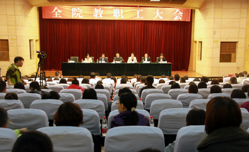 10月13日下午,我院举行全院教职工大会,院长庄群华,院党委书记兼副院长左彤云,副院长刘小廷、赵凯雷,院长助理赵湘莲、王健以及全院教职工参加了会议。庄群华在会上作工作报告,左彤云主持大会。