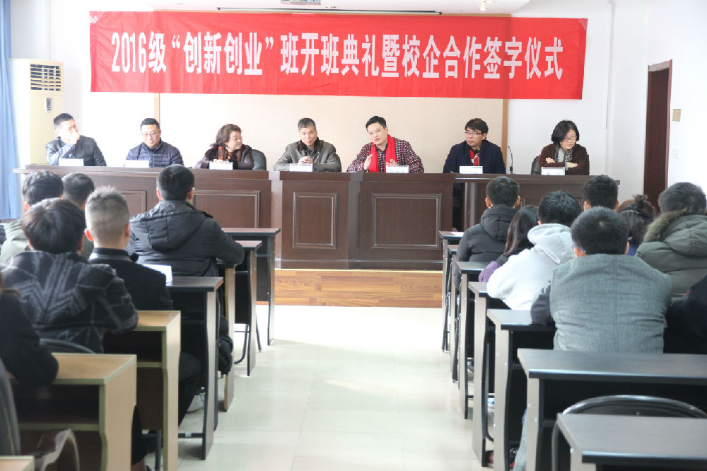 12月28日下午,经济与管理系召开2016级创新创业班开班典礼。副院长刘小廷、校企合作单位南京博峻集团董事长屈伯俊先生、总经理王翔先生、我院教务处处长吕立志、学生处处长姚强、经济与管理系领导共同参加了开班典礼。