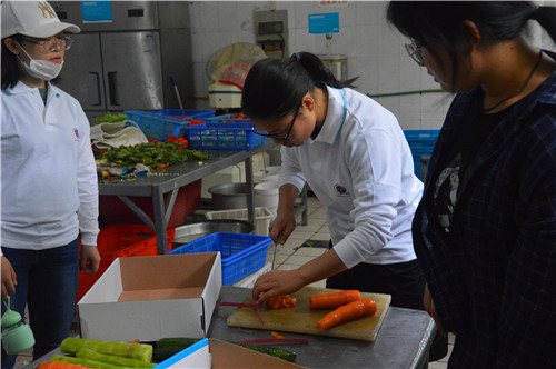根据比赛安排,每个系准备3-4道菜品,比赛从早上七点半开始,选手们各自有条不紊地忙碌着,洗、切、剁、拍,个个像模像样,引得观赛同学纷纷赞叹。厨房锅重火大与家庭中使用的灶具有所不同,炒制过程中,选手们配合默契,精心烹饪,不一会一道道色香味美的菜肴便纷纷亮相。