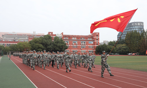 2020级全体新生集结在田径场,他们军容严整,目光坚毅,接受全院师生的检阅。军训汇报表演在庄严的国歌声中拉开了帷幕,总指挥唐峰请学院领导检阅训练成果,院长庄群华下达“开始!”命令。