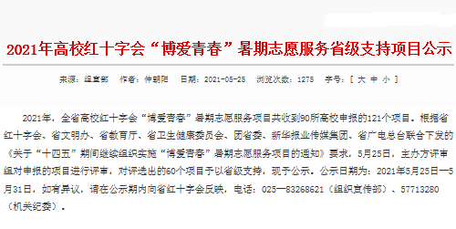 根据省红十字会、省文明办、省教育厅、省卫生健康委员会、团省委、新华报业传媒集团、省广电总台联合下发的《关于“十四五”期间继续组织实施“博爱青春”暑期志愿服务项目的通知》要求, 2021年,省红会面向全省高校开展“博爱青春”暑期志愿服务项目申报评选,最终经主办方评审组审核,对我院《留下温暖守护成长》等60个项目予以省级支持,提供资助经费用于项目活动开支。