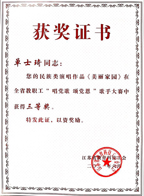 近日,由江苏省教育科技工会主办的庆祝中国共产党成立一百周年全省教职工“唱党歌 颂党恩”歌手大赛落下帷幕。由我院工会选送,基础教育系教师单士琦演唱的《美丽家园》荣获民族唱法三等奖。