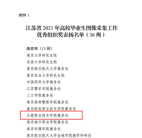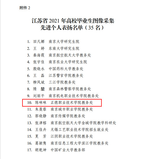 近日,江苏省高校365英国指导服务中心发布《关于公布江苏省2021年高校毕业生图像采集工作表扬名单的通知》(苏教指通〔2021〕79号),我院获“2021年度高校毕业生图像采集工作优秀组织奖”,教务处陈咪咪老师获评“江苏省2021年高校毕业生图像采集工作先进个人”。