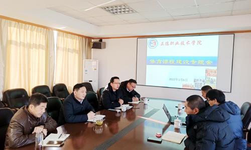 2022年1月6日上午,学院在行政楼二楼会议室召开体育课程建设专题会议,副院长江爱华,教务处处长王俊,公共教学部主任詹勇虎,副主任、党支部书记杨卫东以及体育教师参加了会议。