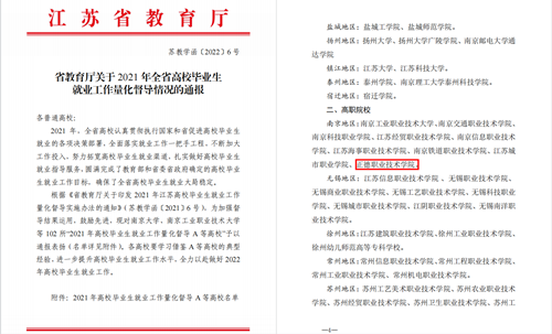 近日,江苏省教育厅公布了2021年全省高校毕业生就业工作量化督导情况,我院被评为“2021年高校毕业生就业工作量化督导A等高校”。在全省102所获得通报表扬的A等高校中,我院是南京地区唯一获A等高校的民办高职院校。