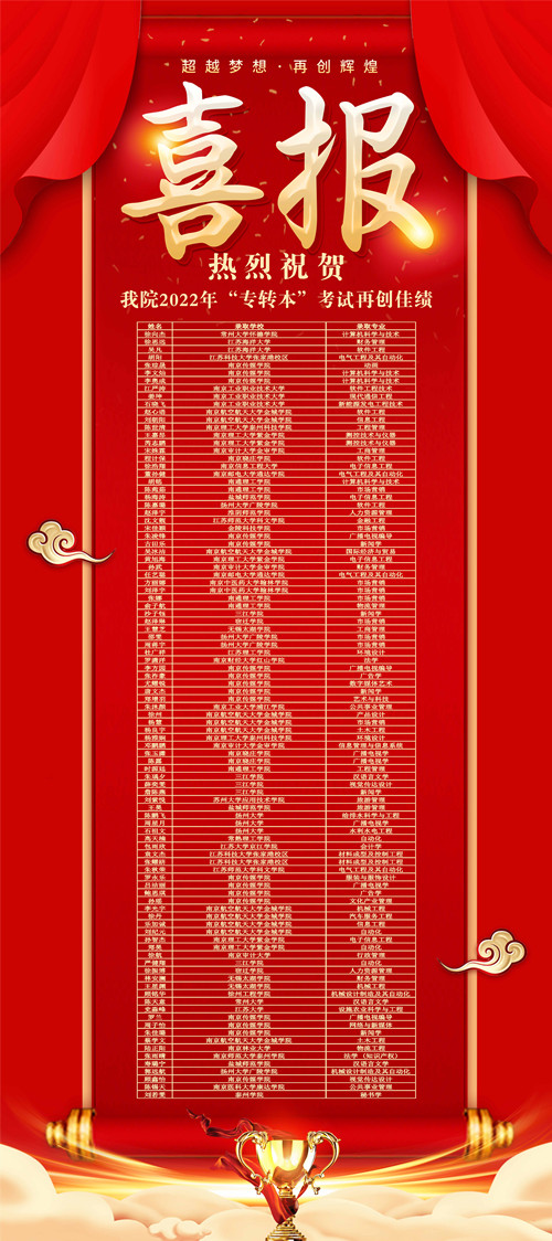 近日,我省2022年“专转本”选拔考试录取结果出炉,我院99名同学分别被南京信息工程大学、扬州大学、江苏大学、常州大学、金陵科技学院等本科院校录取。我院2022年“专转本”录取率继续在同类院校中名列榜首。