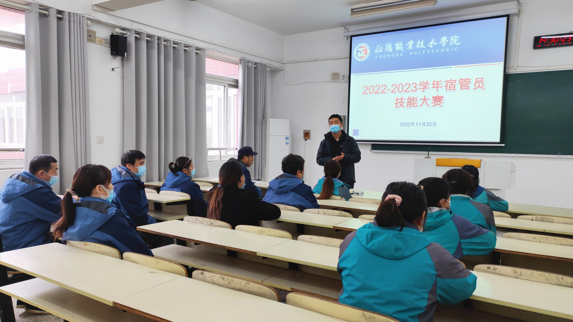 为进一步加强我院宿舍管理员队伍建设,提升管理水平和职业能力, 11月22日下午,学生宿舍管理员技能大赛在2304教室举行。学生处、各系辅导员代表、航宇物业、三维达物业相关负责人出席活动,学生处副处长毛茂主持比赛。