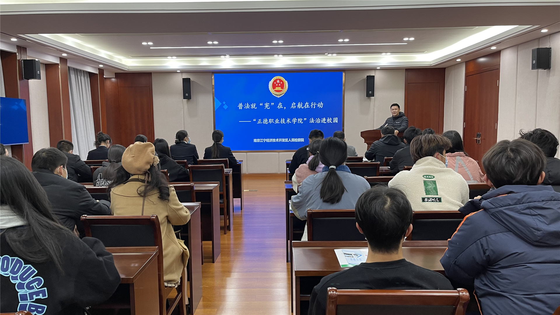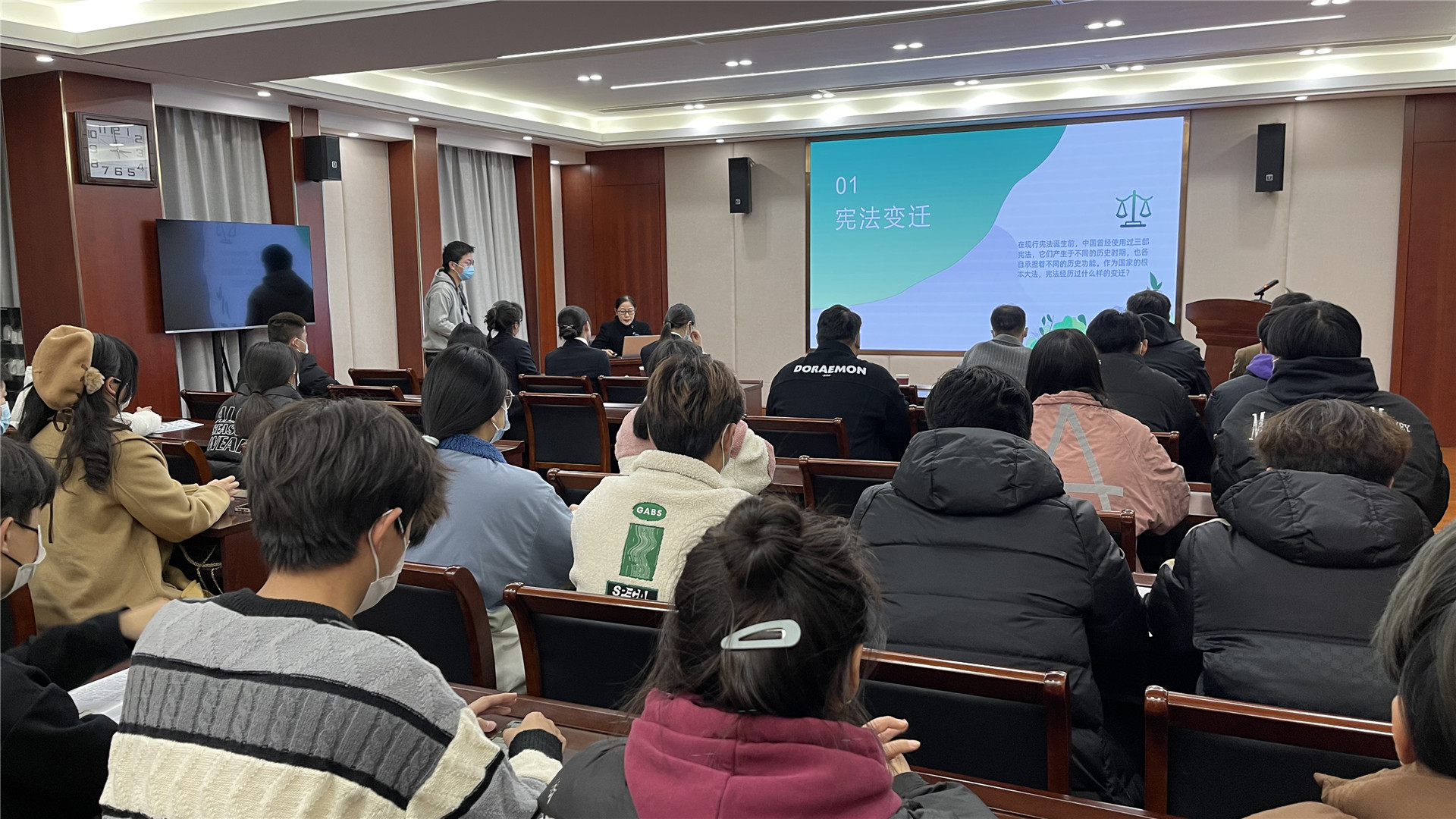 2022年12月2日, 南京江宁经济技术开发区人民检察院周力检察官、乐行公益张立琴律师到校通过线上线下方式为我院学生开展以“普法就宪在,启航在行动”为主题的专题宪法公开课。通过高校电信网络犯罪、校园欺凌等违法犯罪问题的类型,从宪法的角度进行了全面解读,案例典型、发人深省,既通过案例讲解普及了宪法知识,又通过问题剖析提升了法制观念与防范意识,受到师生的好评。