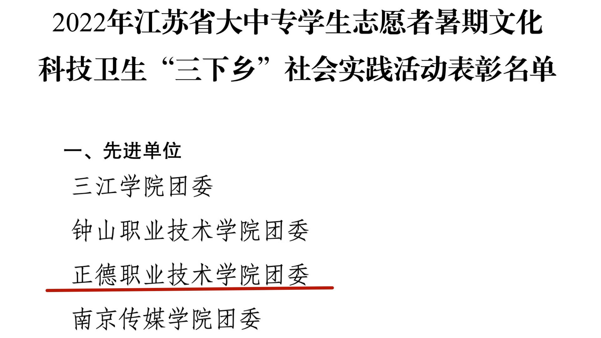 为进一步推进社会实践活动持续深入开展,根据中共江苏省委宣传部、江苏省文明办、江苏省教育厅、江苏省新闻出版局、共青团江苏省委、江苏省学联联合发文《关于公布2022年全省大中专学生志愿者暑期文化科技卫生“三下乡”社会实践活动先进集体和个人名单的通知》(团苏委联【2022】23号),院团委荣获江苏省暑期“三下乡”社会实践先进单位,经济与管理系“梦想改造+为梦想加油”乡村振兴暑期实践团荣获江苏省暑期“三下乡”社会实践优秀团队,民用航空系平修阳同学、汽车与机电工程系徐莹同学荣获江苏省暑期“三下乡”社会实践先进个人称号、电子与信息技术系团总支书记何华智荣获江苏省暑期“三下乡”社会实践先进工作者称号,基础教育系王特同学的《挖掘乡村文化,助推乡村振兴》荣获江苏省暑期“三下乡”社会实践优秀调研报告。