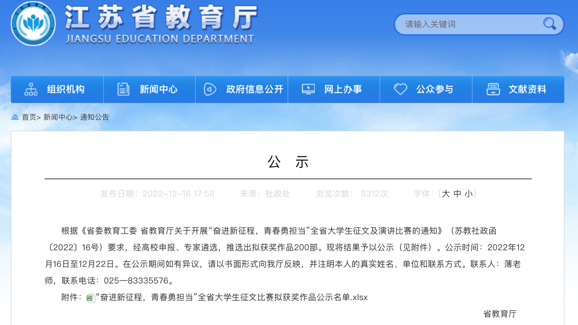 此次大赛以“奋进新征程,青春勇担当”为主题,比赛自10月底启动,历时两个月,全省百余所高校参与。我院收到通知后,高度重视,由团委牵头联合公共教学部与各系,在校内开展了征文选拔比赛,在全部学生参与的基础上,经班级初赛、系部复赛共选拔25篇稿件进入院级决赛,经过在线打分、评议讨论、专家指导等评审环节,选定3篇征文作品代表学校参加江苏省大学生征文比赛。