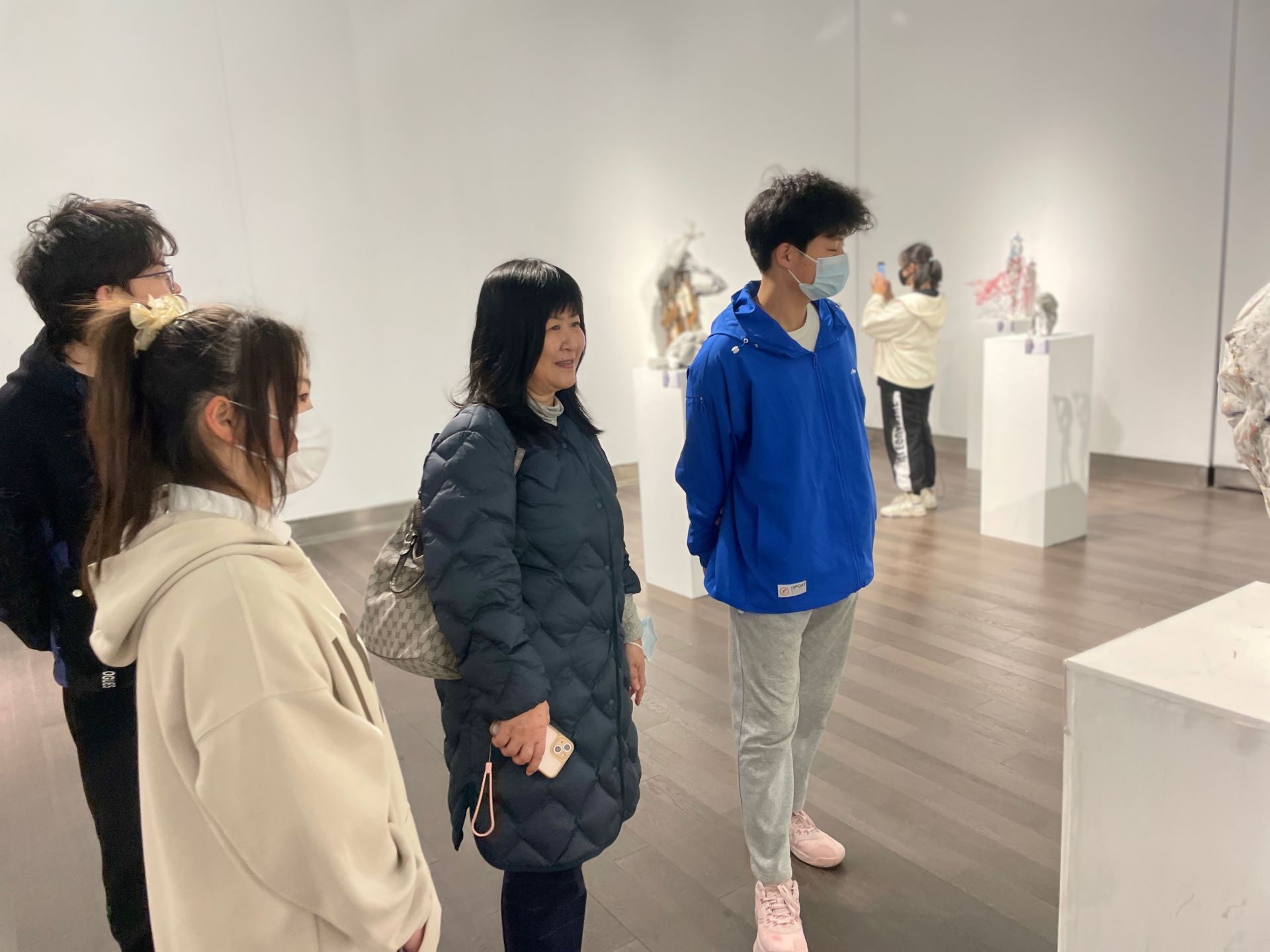 在观展过程中,钱抒老师带领同学们一边看,一边仔细讲解。特别是一些青年艺术家的作品,如综合材料作品“空濛系列”用一种现代抽象的语言来表达对宇宙世界中“蒹葭离披去,天水相与永”的认知与理解;雕塑“云端”采用钢筋水泥等材料塑造,这是艺术家的所思所想表达的设计语言;作品“南京,幸福丫”,通过有趣的小黄鸭排列,构建了一个天真梦幻的场景。很多同学通过参观这些设计感的空间形式,领悟到了艺术与建筑、室内设计的关系,也明白了构成设计中点、线、面的在绘画、雕塑、设计中的运用。同学们在老师指导下,认真学习、仔细体会作品的意境,对展出的作品赞叹不已。在切身感受艺术熏陶的同时纷纷用手机记录下精彩作品,相互讨论,交流感想。表示回去后要好好研究,并进一步思考绘画艺术和我们所学环境艺术设计专业之间的关系。