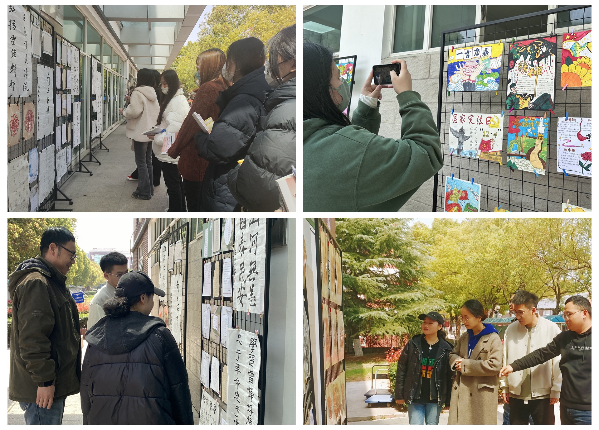 在运动馆前展示的作品引起同学们的驻足观看,三三两两在一幅幅画中徘徊,寻找自己的作品或欣赏他人的创作。