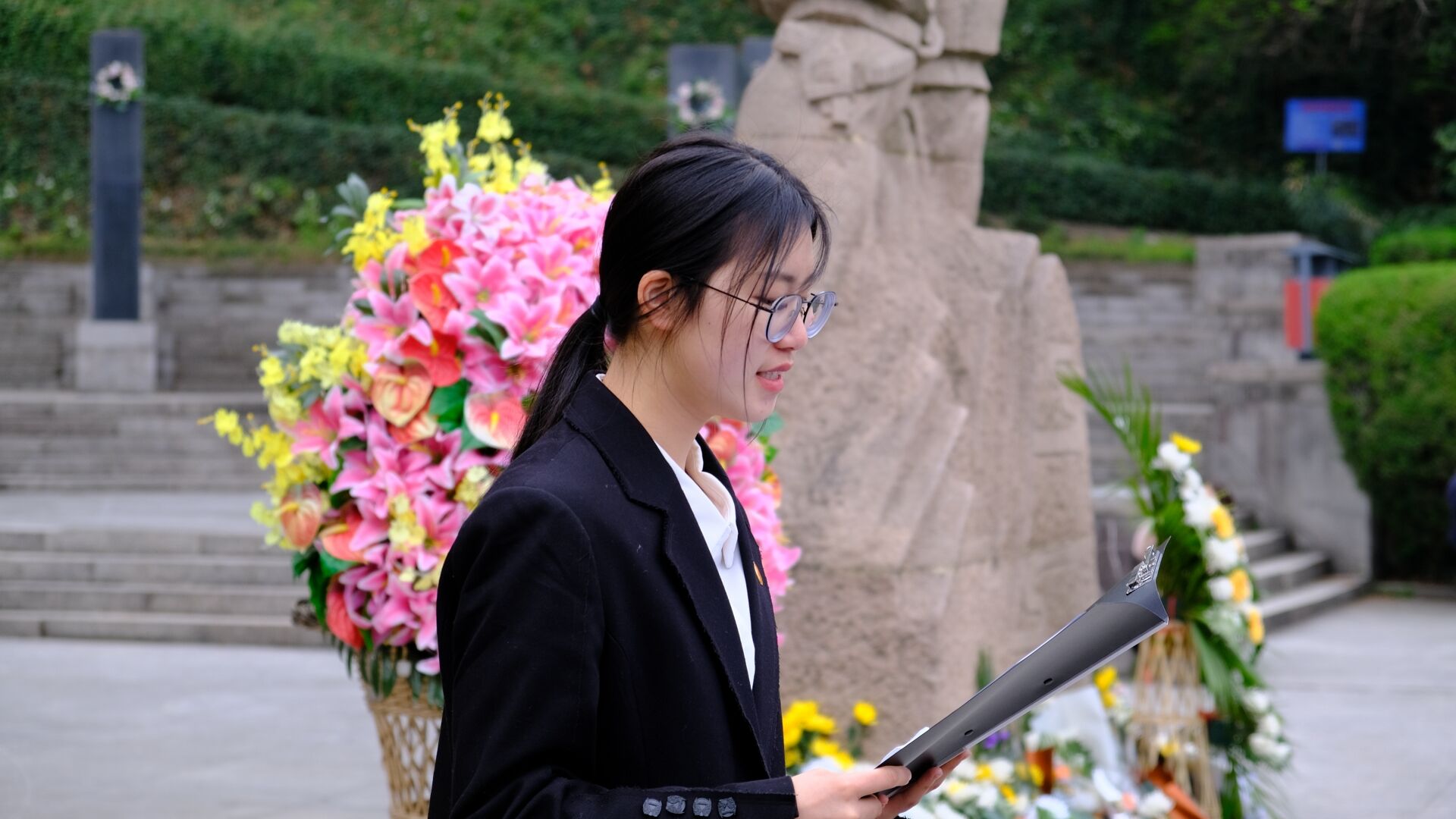 学生代表、经济与管理系学生会主席团成员王骁发言,她首先表达了对抗日航空先烈们的深切悼念和无限敬仰。然后,她分享了此次参观学习后的感受。最后,她指出作为新时代的青年、学生干部,要学习先烈矢志不渝的崇高追求,要弘扬先烈顽强拼搏的革命气魄,要践行先烈一心为民的赤子情怀。