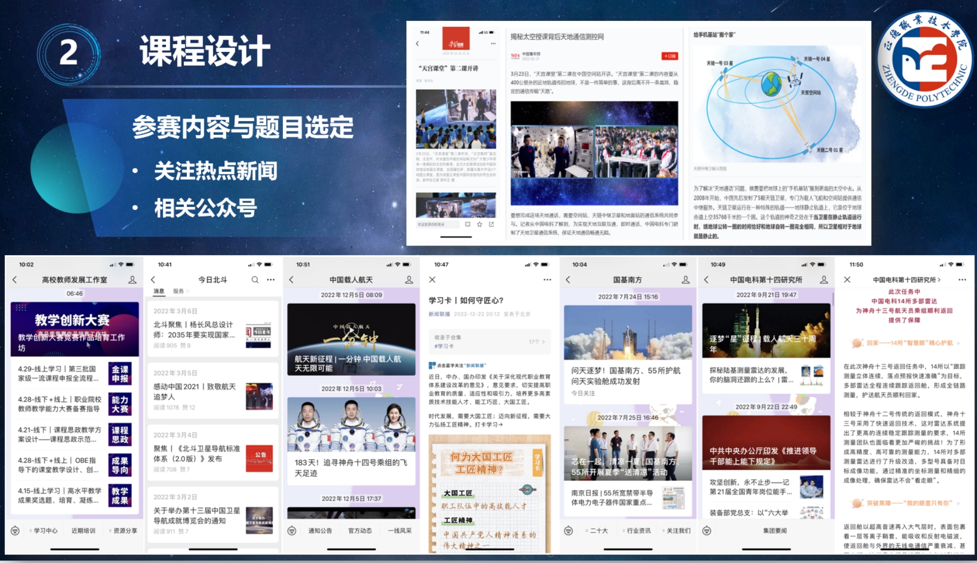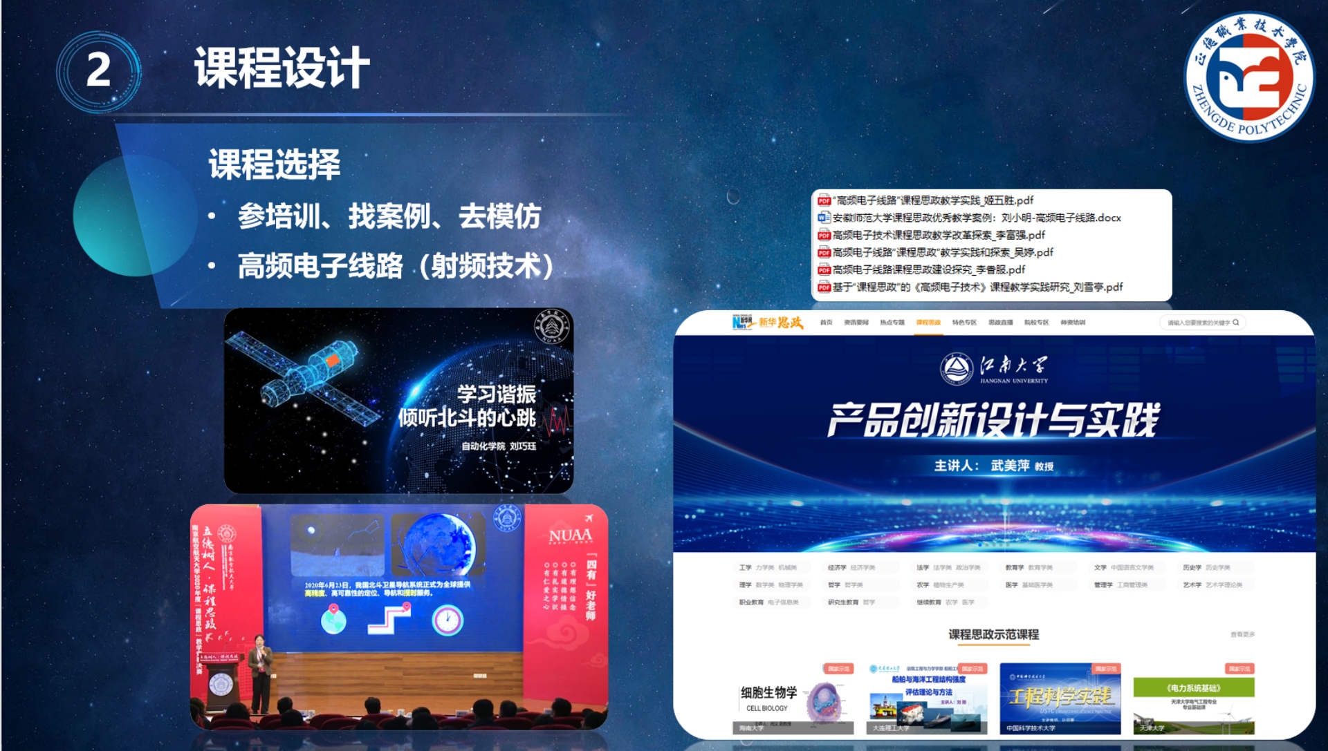 刘佳老师结合自己亲身经历从思想备赛、课程设计、团队助力几个角度分享了她在准备课程思政竞赛时的经验。她在分享中提到,参加课程思政教学竞赛首先是思想上的认同和心理上的准备,充分认识到课程思政建设的必要性,是思政育人的动力,也是育人实效的保障,并以《射频技术》课程为例,讲解了将思政元素融入课程设计的方法。教师要结合自己教授的课程养成挖掘思政元素的意识,培养学生精益求精的大国工匠精神,激发学生科技报国的家国情怀和使命担当。她寄语青年教师要突破自我、自我成长,也要直面焦虑、缓解压力。