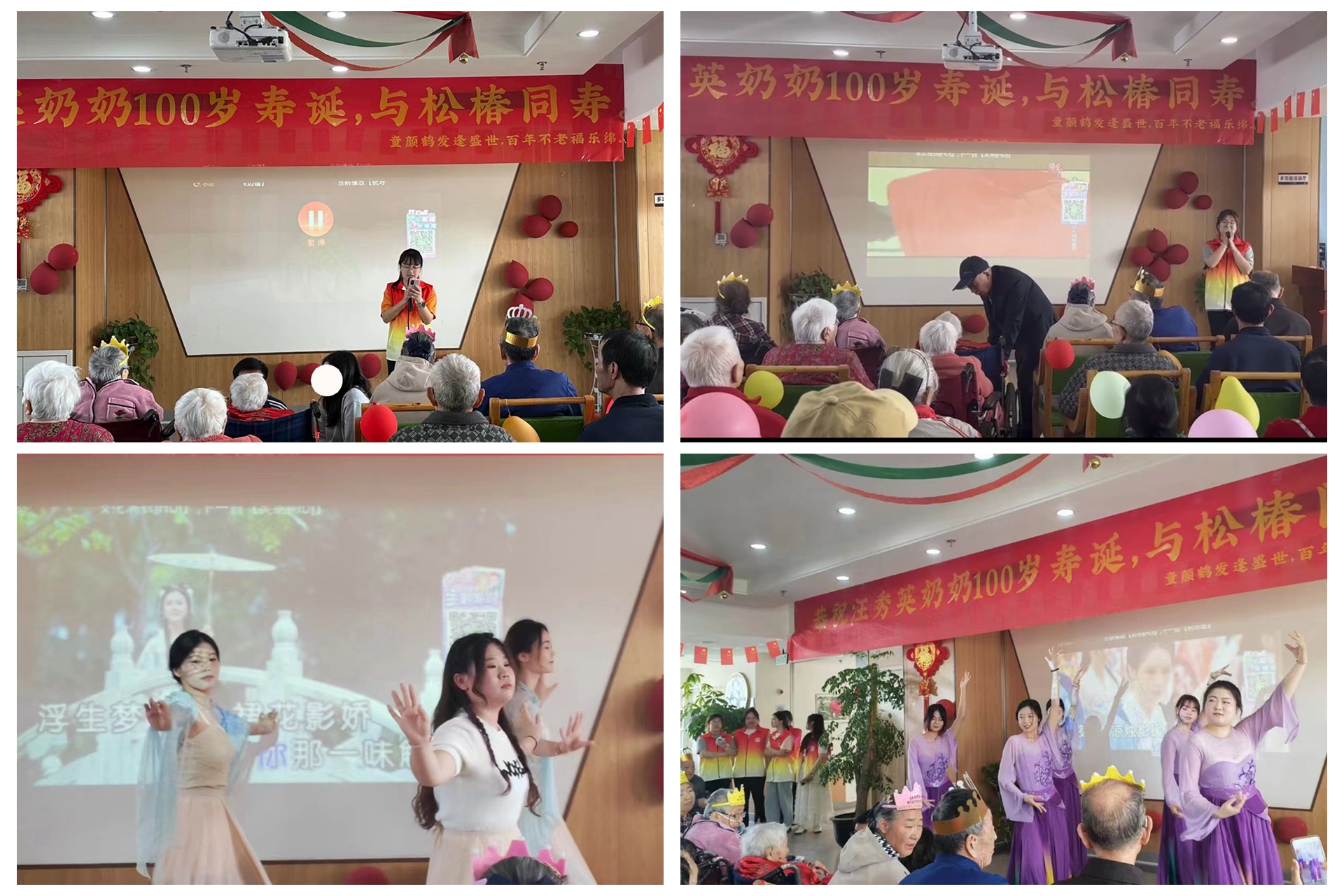 4月25日上午,银城松椿颐养园为四月份生日的8个老人过集体生日,其中有一位百岁老人——汪秀英奶奶。基础教育系“微光”巾帼志愿者队的20名志愿者前来和这里的50多位老人们以及20多位家属们共同度过了一场难忘的集体生日会。
