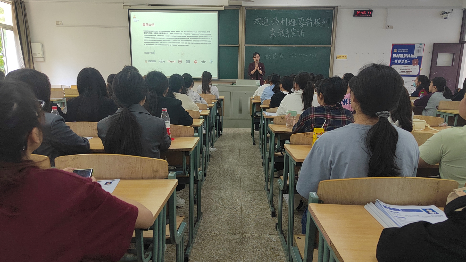 随后,周老师从企业文化介绍、岗位选择、教研团队、发展规划四个方面向同学们讲诉相关信息。在玛利亚蒙台梭利,立志将孩子培养成为一个多维发展且对知识充满渴望的人,她们相信教育是成功和充实生活的基石。其次,也了解到环境在培养一个快乐、自信、安全、有能力的孩子的过程中起着决定性的作用。因此,非常重视建立一个精心规划和资源充足的环境,这个环境是温暖、友好且吸引孩子的温床。