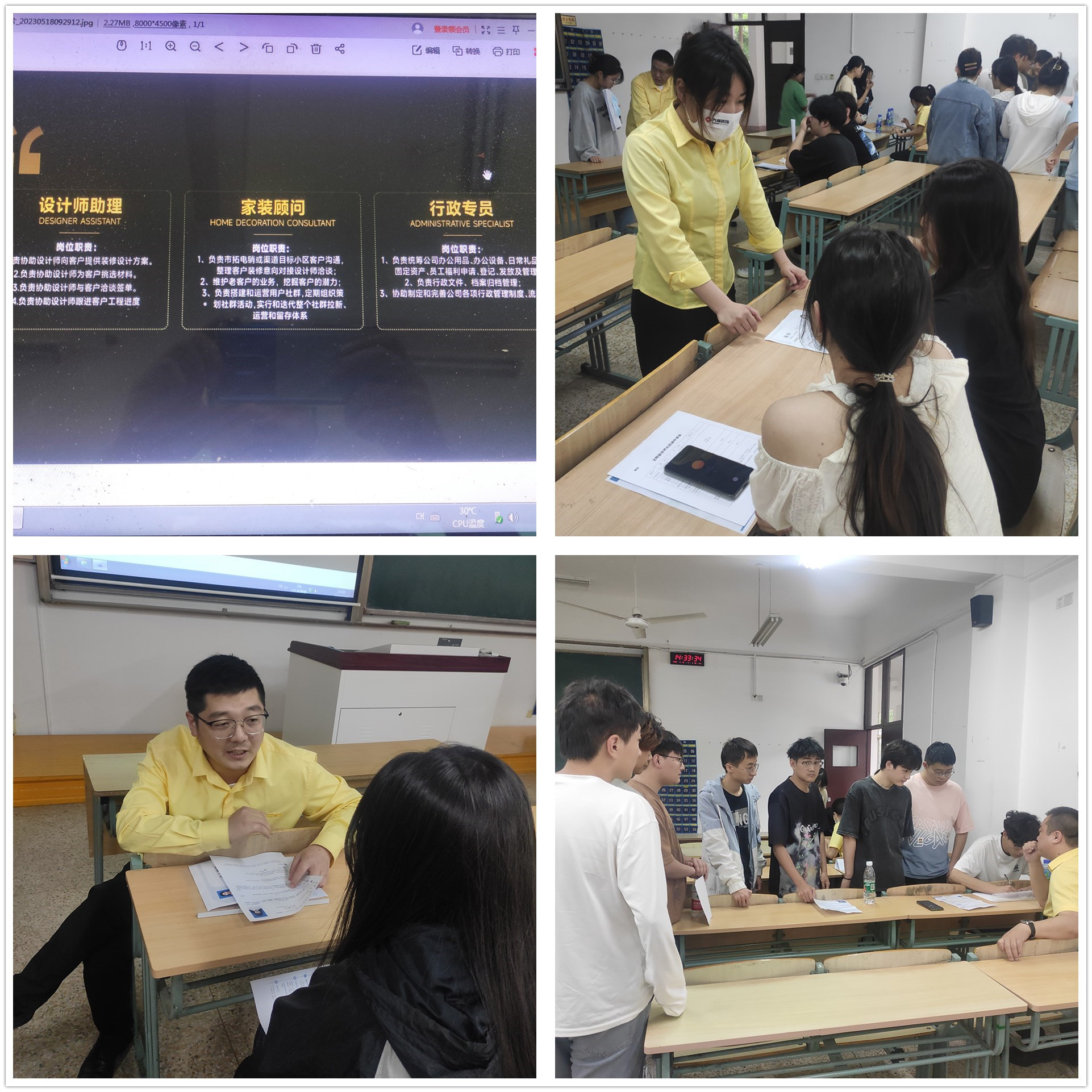 为切实做好本系毕业生就业工作,大力构建毕业生与用人单位的交流平台,贯彻落实学院关于学生岗位实习的要求,2023年5月19日艺术设计与建筑工程系邀请方林家居装饰有限公司南京分公司在9108教室召开专场招聘会。