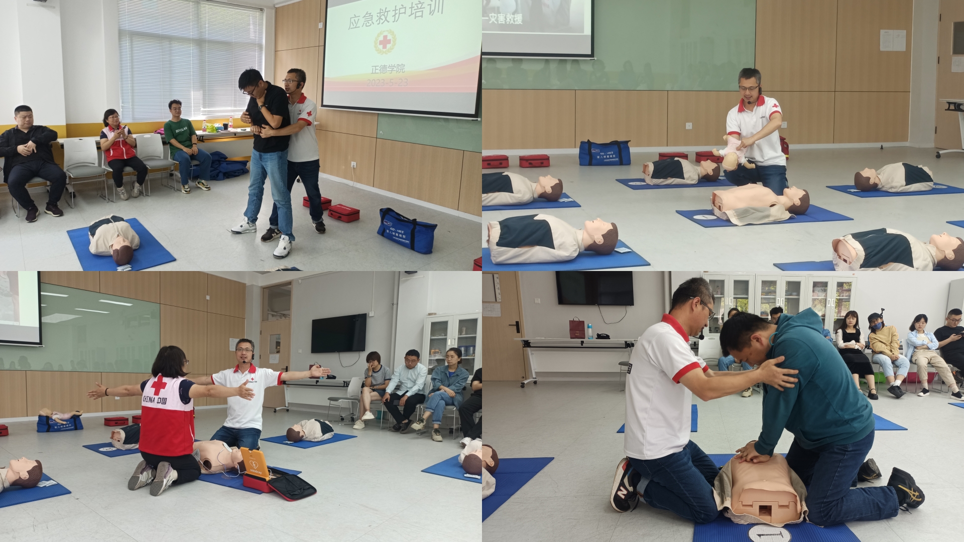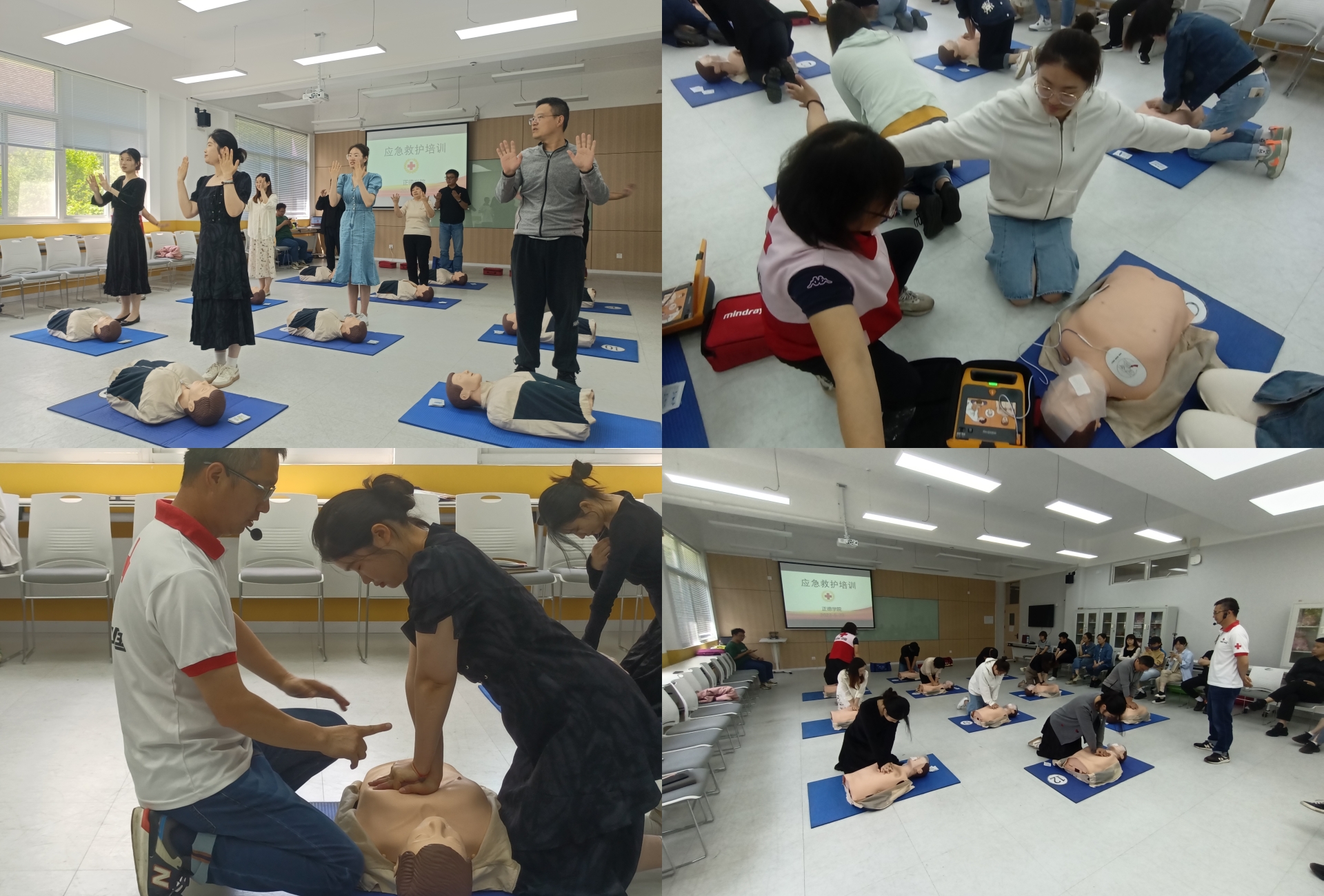 在短短几个小时的学习和模拟急救情境实操训练中,辅导员们认真练习了胸外按压、开放气道、人工呼吸、AED使用、海姆立克法等急救方法,并反复确认急救过程中细节的准确性与有效性。培训现场气氛活跃,学员们纷纷动手实践,进行操作练习。