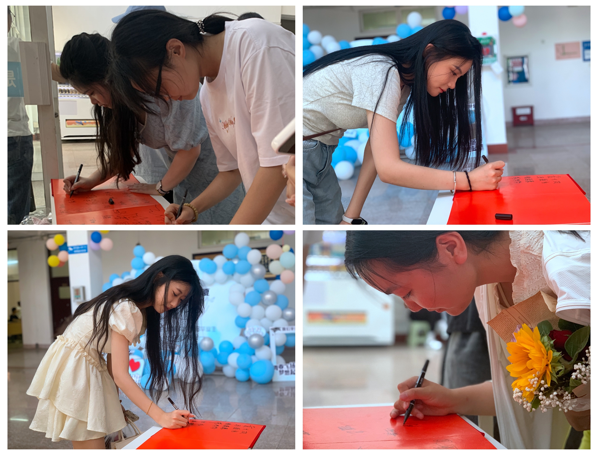 活动的前一天,毕业班的一些班委们提前来到学校和大一大二的学弟学妹们开始做欢送会的准备工作,他们把9号楼的大厅进行了精心的布置,辅导员沈言静老师还从家带来熨斗亲自为学生熨烫学士服。