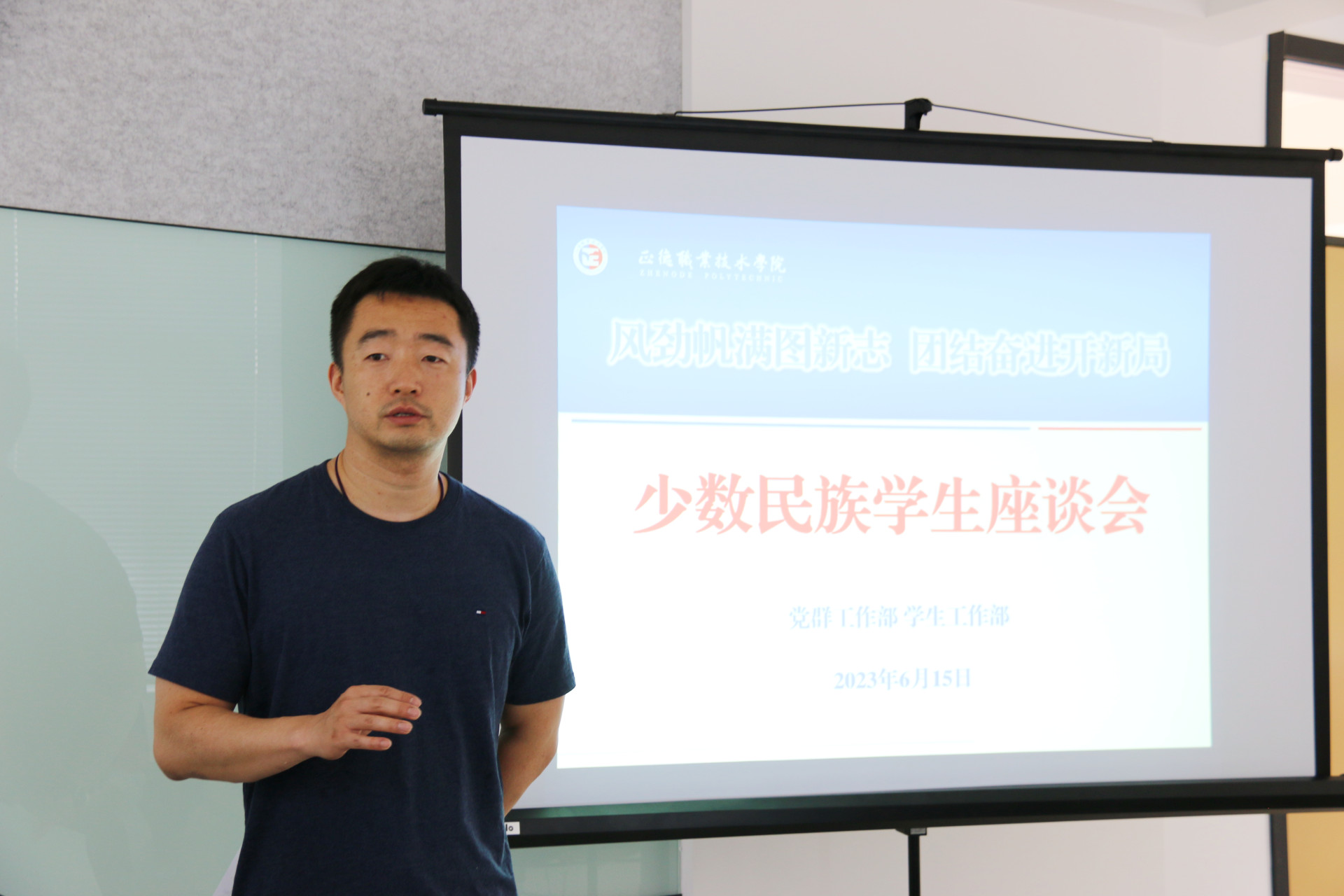 为深入学习贯彻习近平总书记关于民族团结进步工作的重要精神指示,进一步提升少数民族学生教育、管理和服务工作,铸牢中华民族共同体意识,促进各民族学生交往交流交融,6月15日下午,我院在“一站式”学生社区召开了少数民族学生座谈会,党群工作部副部长周慧、相关老师以及来自7个民族的16名少数民族学生代表参加了本次座谈会,座谈会由学生处副处长毛茂主持。