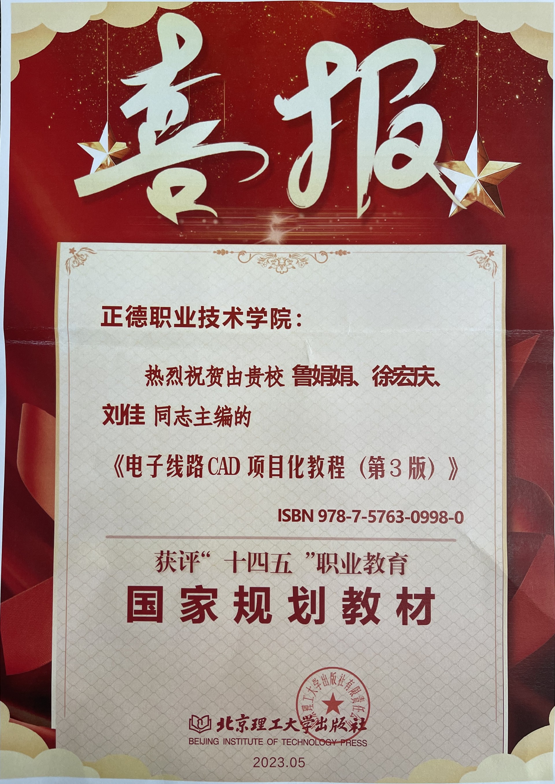 近日,教育部职业教育与成人教育司发布《关于拟入选首批“十四五”职业教育国家规划教材名单的公示》。经申报、形式审查、专项审核、网络和会议评审、专家复核等程序,我院电子与信息技术系徐宏庆、刘佳、鲁娟娟老师编写的《电子线路CAD项目化教程(第3版)》,成功获评“十四五”职业教育国家规划教材,该系列教材连续入选“十三五”、“十四五”国家规划教材库,是我院教材建设的重大成果。同时是我院“十四五”规划实施以来,深入开展“三教”改革的标志性成果。