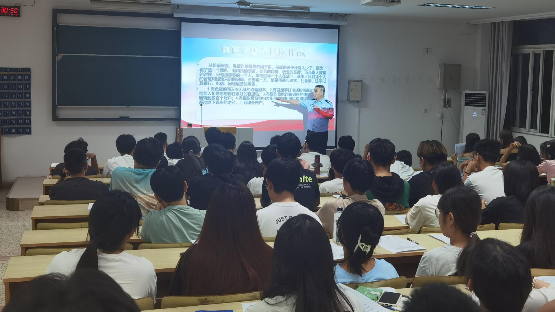 9月11日晚,学院保卫处、学生处牵头,邀请江宁开发区派出所娄军来警官走进我院,为2023级新生开展开学第一课“反诈宣讲”。民用航空系作为本次活动第一站,全体新生热情高涨,课堂氛围活跃。