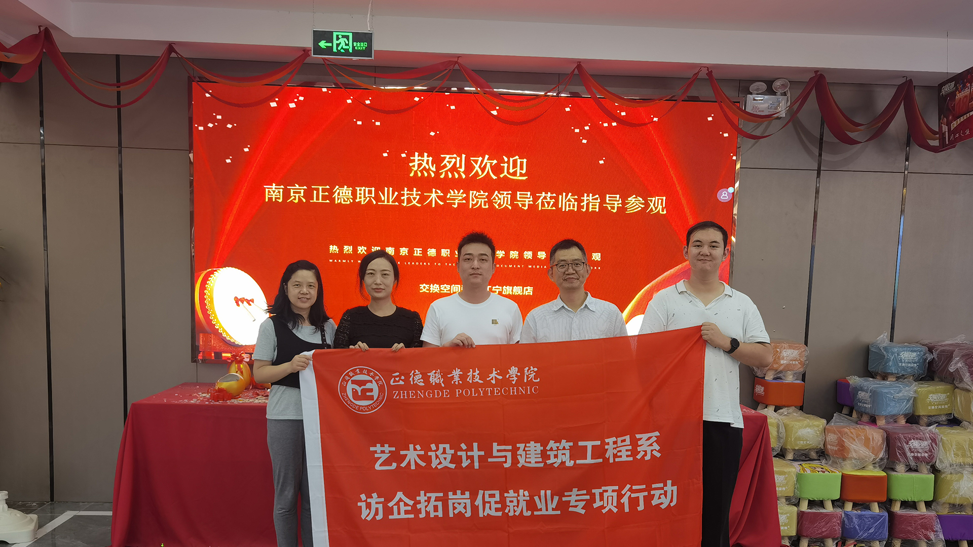 为进一步落实学校访企拓岗促就业专项行动,推进我院毕业生多维度、高质量就业,9月19日,艺术设计与建筑工程系副主任周卫(主持工作)、杨瀛、吴青、夏正宇深入企业为毕业生开拓就业新渠道,走访了南京交换空间家具有限公司(江宁旗舰店),与总经理戴朝坤进行了合作交流,目前校企双方共同探讨合作协议内容,初步达成合作意向。