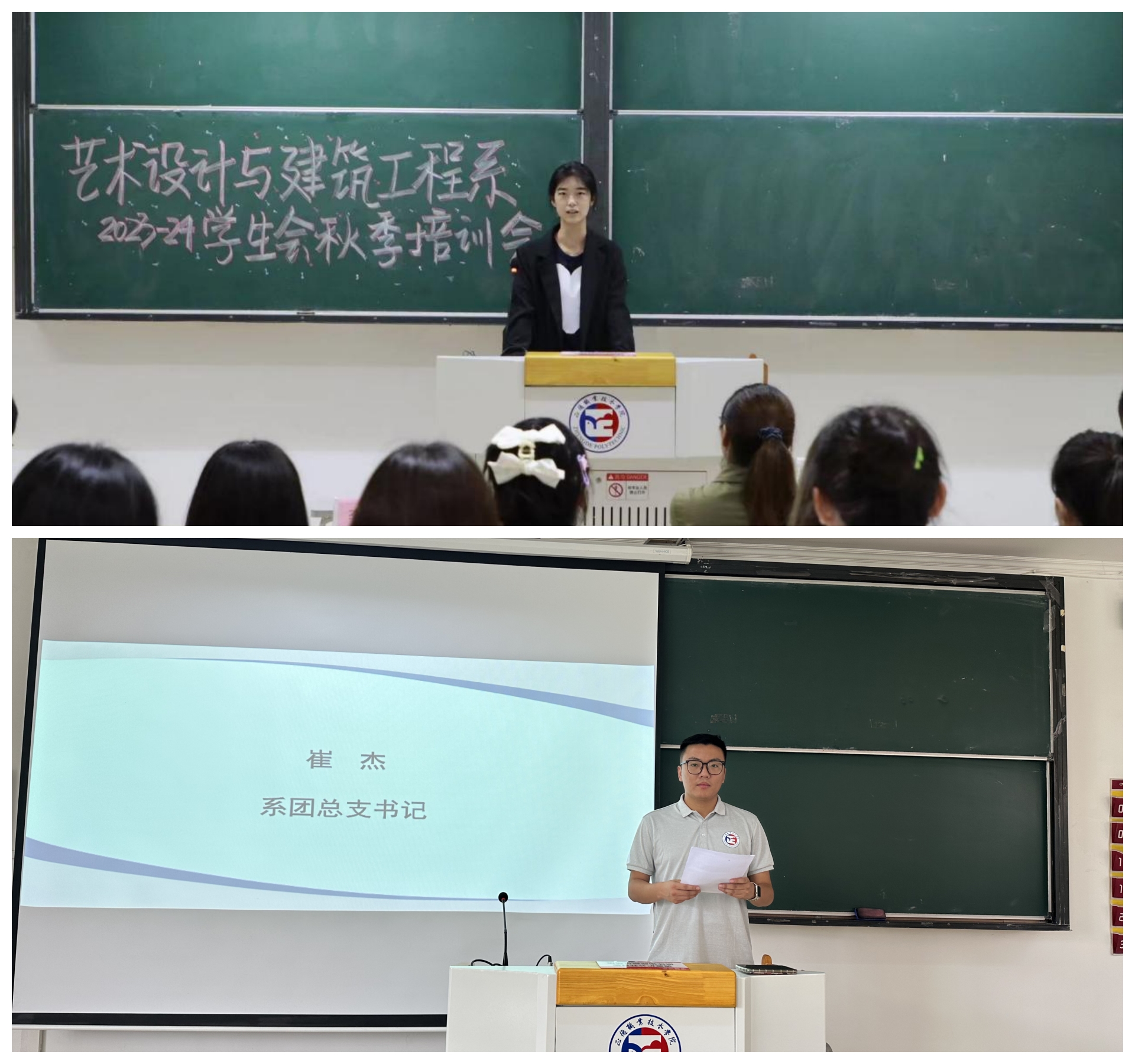 为了进一步提高艺术设计与建筑工程系学生干部的整体素质,加强学生队伍的凝聚力,强化学生干部的自律意识,提高工作效率,保证工作的连续性,使学生干部能有效开展工作,更好地服务学院、服务同学。2023年9月26日晚,艺术设计与建筑工程系在1202阶梯教室召开了学生干部培训会,本次会议由学生会外联部部长庄宝佳主持,系党支部书记杨春娟、团总支书记崔杰参加本次活动。