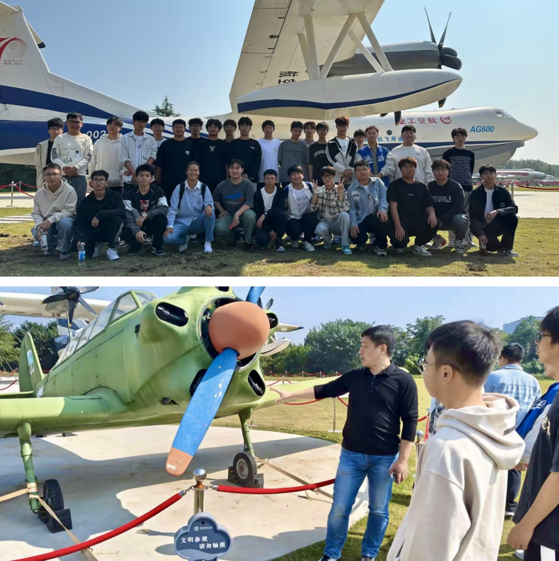 10月18日上午,民用航空系飞机机电设备维修专业2023级新生在专业教师雍巍的带领下,前往南京航空航天大学将军路校区实施航空器维修工程导论课的现场教学。