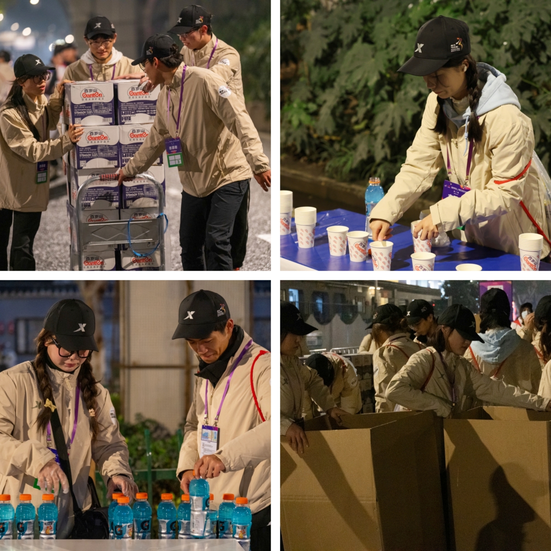 本次南马我院志愿者工作地点在5公里点(近虹悦城)补给处,一共有72个志愿服务点,为3万名参赛选手提供饮用水、功能饮料及能量补给物资。凌晨3点30分,我院志愿者抖擞精神、整装待发,乘车前往服务点集结。尽管车窗外夜色浓厚、寒风刺骨,但依旧遮掩不住志愿者们面庞上洋溢着的兴奋、激动的神情。凌晨4点,全体志愿者井然有序地开始上岗工作。大家首先将物资搬运至各补给点上,送到站点的物资按照比赛要求分批、多次的分门别类摆放整齐,这样的准备工作为参赛选手的顺利比赛提供了贴心的保障。