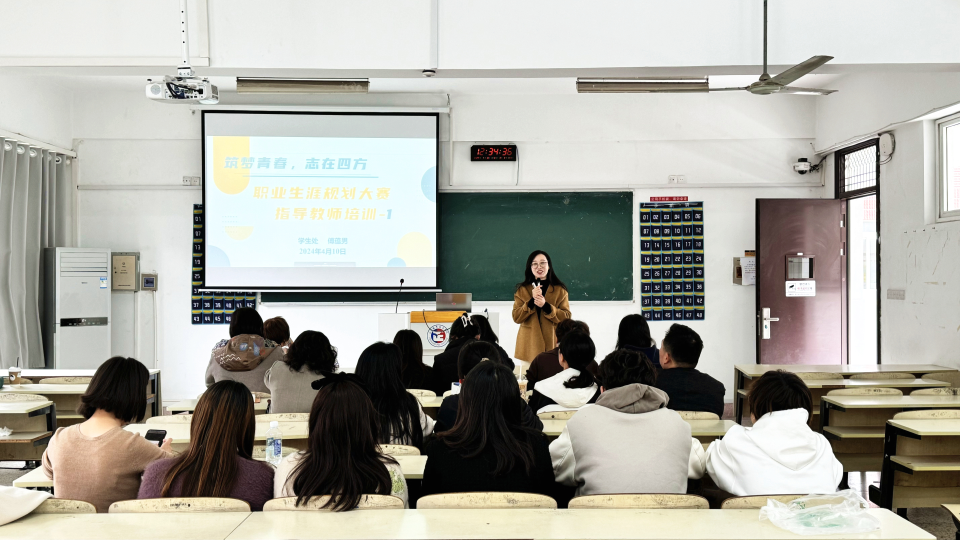为提高我院职业生涯教育专业化队伍建设,积极备战院第十五届大学生职业生涯规划大赛,我院学生处于4月10日中午,在2205教室开展了“筑梦青春,志在四方”学院第十五届职业生涯规划大赛指导教师专题培训。培训旨在帮助各系精准理解大赛的工作目标和相关要求,提升职业生涯规划的指导水平,积极应对新省赛和新国赛,为提升我院参赛水平做好必要准备。培训由学生处傅蕴男老师主讲,学生处处长祝佳俊和各系辅导员以及专业指导教师近30人参加了此次培训会议。