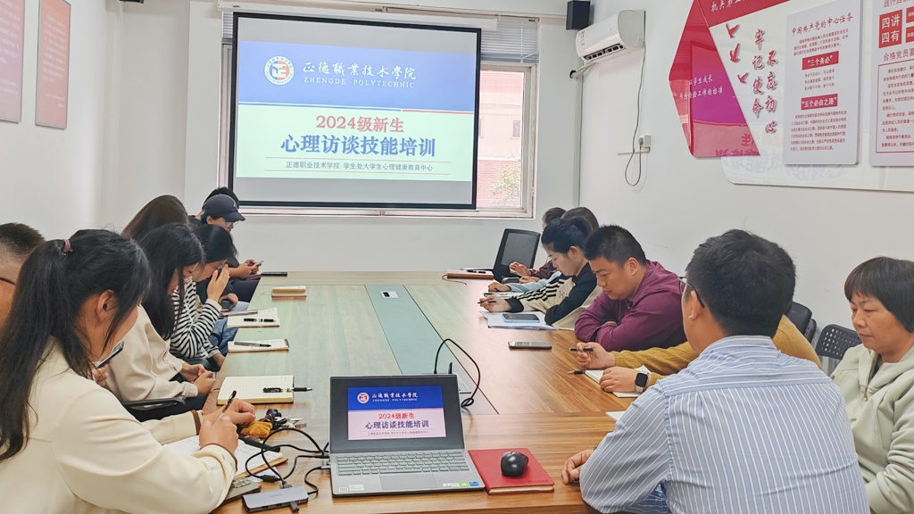 为强化学生心理健康意识,深入了解学生心理状态,提升心理工作的科学性,并提高我院辅导员心理访谈技能,增强其对学生的心理健康教育能力,切实做好学生心理健康教育工作,学生处大学生心理健康教育中心于10月17日上午10时在2207会议室举办了2024级新生辅导员心理访谈技能培训会。学生处处长祝佳俊、心理中心樊荣老师以及全体 2024 级新生辅导员参与了此次培训会。