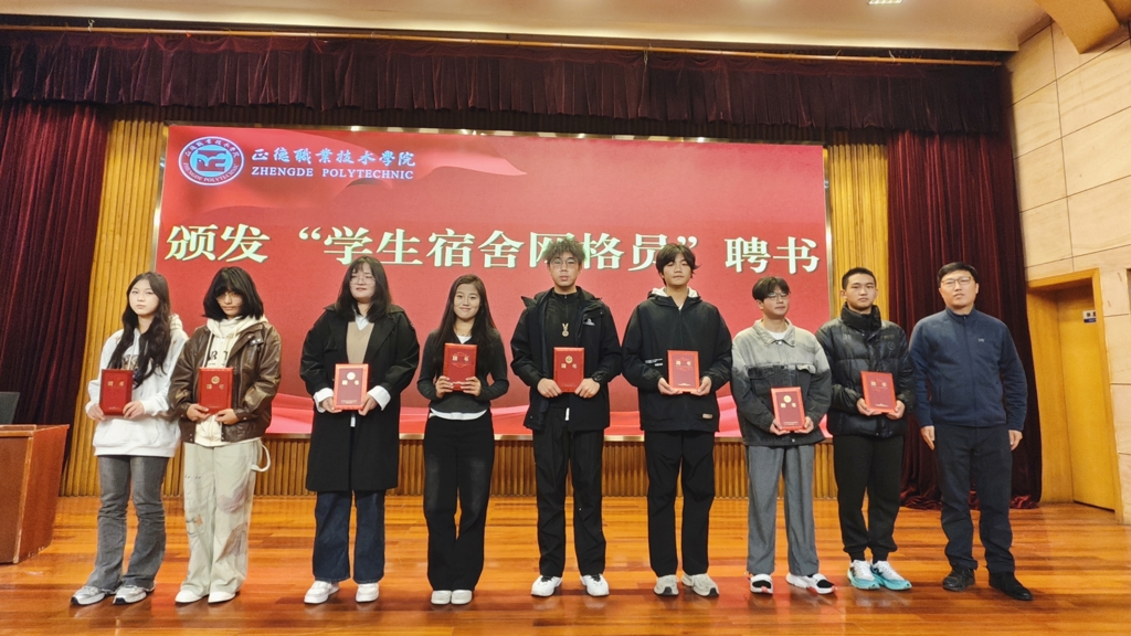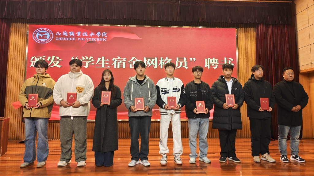 何华智宣读了此次聘任的学生网格员名单,并介绍了我院宿舍网格化管理办法和学生宿舍网格员工作要求。祝佳俊和陈宏波分别上台为公寓网格员颁发聘书。