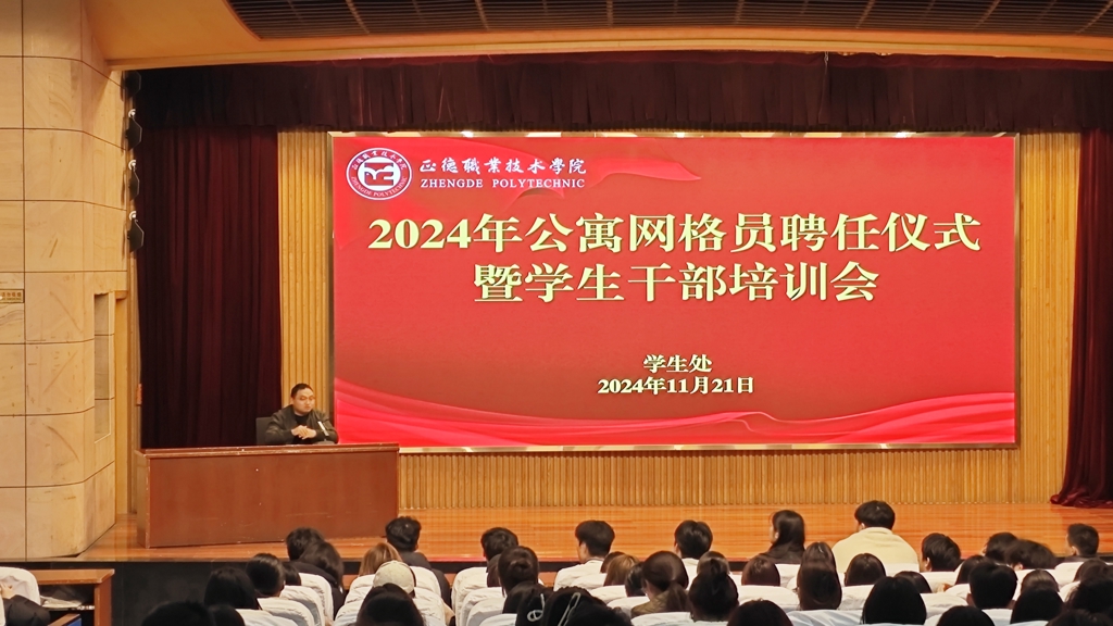 为了健全学生安全工作机制,进一步加强学生公寓管理。11月21日下午,我院在学院报告厅开展公寓网格员聘任仪式暨学生干部培训会。学生处处长祝佳俊、后勤保卫处处长陈宏波和各系公寓网格员、厅长、室长等350余人参会,会议由学生处副处长何华智主持。