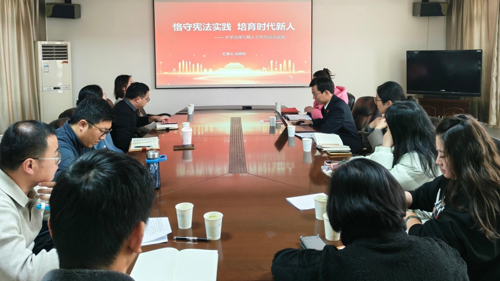 为深入学习贯彻习近平法治思想,持续推进校园法治建设,12月17日下午,我院机关第五党支部在行政楼二楼会议室举行宪法专题学习活动,特邀江宁区人民检察院第二检察部四级检察官助理吕政权同志讲授《恪守宪法实践 培育时代新人》专题党课。活动由党支部书记祝佳俊主持,学院党委副书记、副院长梁薇出席本次活动,支部全体党员、思政课教师和辅导员代表参加学习。